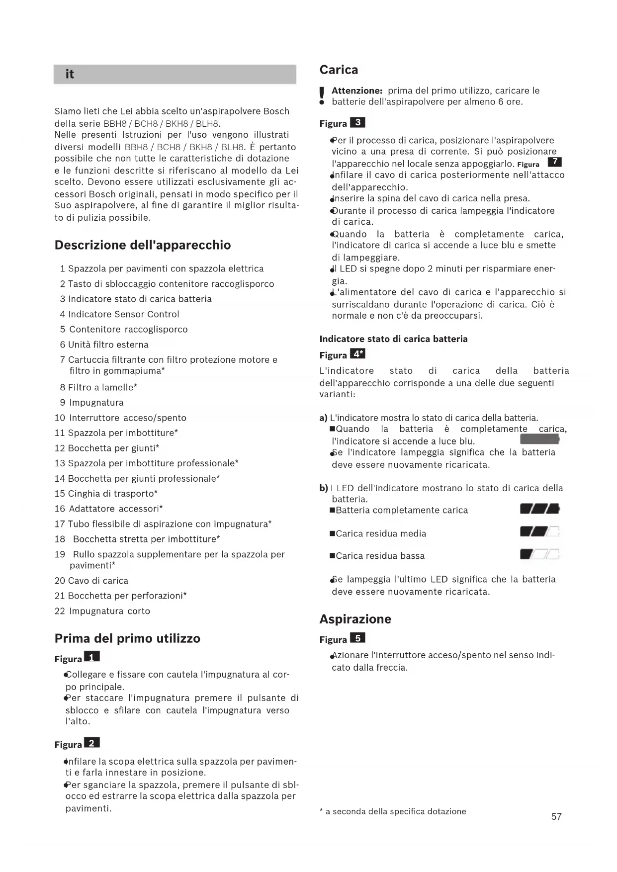 Siamo lieti che Lei abbia scelto un'aspirapolvere Bosch della serie BBH8 / BCH8 / BKH8 / BLH8. Nelle presenti Istruzioni per l'uso vengono illustrati diversi modelli BBH8 / BCH8 / BKH8 / BLH8. È pertanto possibile che non tutte le caratteristiche di dotazione e le funzioni descritte si riferiscano al modello da Lei scelto. Devono essere utilizzati esclusivamente gli ac- cessori Bosch originali, pensati in modo specifico per il Suo aspirapolvere, al fine di garantire il miglior risulta- to di pulizia possibile. Descrizione dell'apparecchio 1 Spazzola per pavimenti con spazzola elettrica 2 Tasto di sbloccaggio contenitore raccoglisporco 3 Indicatore stato di carica batteria 4 Indicatore Sensor Control 5 Contenitore raccoglisporco 6 Unità filtro esterna 7 Cartuccia filtrante con filtro protezione motore e filtro in gommapiuma* 8 Filtro a lamelle* 9 Impugnatura 10 Interruttore acceso/spento 11 Spazzola per imbottiture* 12 Bocchetta per giunti* 13 Spazzola per imbottiture professionale* 14 Bocchetta per giunti professionale* 15 Cinghia di trasporto* 16 Adattatore accessori* 17 Tubo flessibile di aspirazione con impugnatura* 18 Bocchetta stretta per imbottiture* 19 Rullo spazzola supplementare per la spazzola per pavimenti* 20 Cavo di carica 21 Bocchetta per perforazioni* 22 Impugnatura corto Prima del primo utilizzo Figura