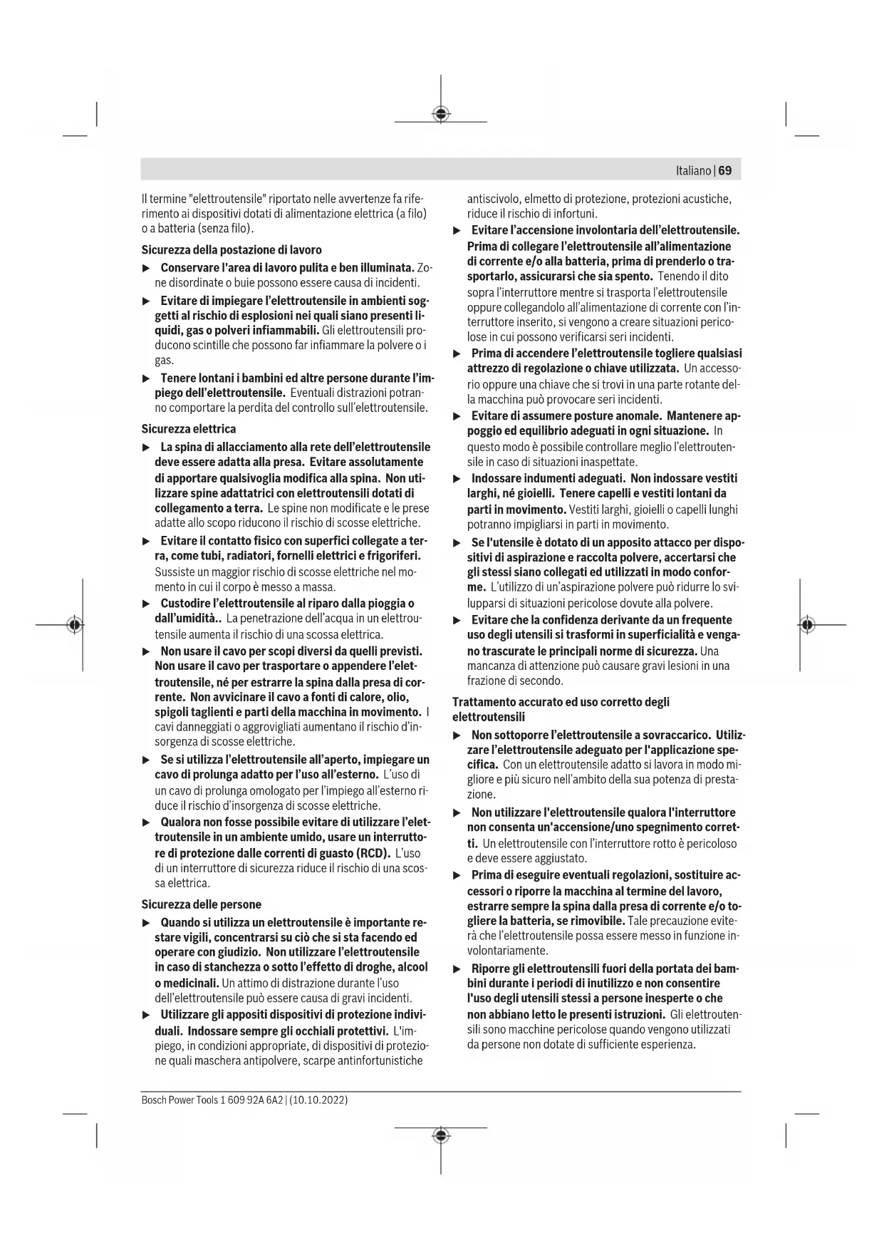 I valori riportati per livelli del numero di giri sono indicativi. Montaggio Montaggio del dispositivo di protezione u Prima di qualunque intervento sull’elettroutensile estrarre la spina di rete dalla presa. Avvertenza: dopo una rottura della mola abrasiva durante il funzionamento, oppure in caso di danni ai dispositivi di al- loggiamento sulla cuffia di protezione/sull’elettroutensile, l’elettroutensile andrà immediatamente inviato al Servizio Clienti post-vendita. Per gli indirizzi, vedere il paragrafo «Servizio di assistenza e consulenza tecnica». Cuffia di protezione per levigatura Applicare la cuffia di prote- zione (11) nell’alloggiamento dell’elettroutensile, sino a quando le camme di codifica della cuffia stessa coincidano con l’alloggiamento. A tale scopo, premere e mantenere premuta la leva di sbloccag- gio (1). Spingere la cuffia di protezio- ne (11) sul collare dell’alberi- no, sino a quando la fascia della cuffia di protezione si trovi sulla flangia dell’elet- troutensile e ruotare la cuffia di protezione sino a farla scattare udibilmente in posizione. Adattare la posizione della cuffia di protezione (11) in base alla lavorazione da eseguire. A tale scopo, spingere la leva di Bosch Power Tools 1 609 92A 6A2 | (10.10.2022)76 | Italiano sbloccaggio (1) verso l’alto e ruotare la cuffia di protezione (11) nella posizione desiderata. u Regolare sempre la cuffia di protezione(11) in modo che entrambe le camme della levatta di sbloccaggio (1) si innestino negli appositi incavi della cuffia di protezione (11). u Regolare la cuffia di protezione (11) in modo da impe- dire proiezioni di scintille in direzione dell’operatore. u La cuffia di protezione (11) dovrà potersi ruotare sol- tanto azionando la leva di sbloccaggio (1). In caso con- trario, l’elettroutensile non andrà più utilizzato e an- drà inviato al Servizio Assistenza Clienti. Avvertenza: Le camme di codifica sulla cuffia di protezione (11) garantiscono che si possa montare soltanto una cuffia di protezione compatibile con l’elettroutensile del caso. Cuffia di protezione per taglio u Per il taglio utilizzare sempre la cuffia di protezione per il taglio (13) o la cuffia di protezione per la leviga- tura (11) insieme alla copertura per il taglio (15). u Per il taglio nella pietra, provvedere ad un’adeguata aspirazione della polvere. La cuffia di protezione per taglio (13) andrà montata analo- gamente alla cuffia di protezione per levigatura (11). Copertura in metallo per il taglio Montare la copertura in metallo per il taglio (15) sulla cuffia di protezione per la levigatura (11) (vedere fig. A): spostare all’indietro la staffa di ritegno (➊). Innestare la copertura (15) sulla cuffia di protezione per la levigatura (11) (➋). Premere a fondo la staffa di ritegno sulla cuffia di protezione (11) (➌). Per lo smontaggio (vedere immagine B) premere il pulsante sulla staffa di ritegno (➊) e spostarlo indietro (➋). Estrarre la copertura (15) dalla cuffia di protezione (11) (➌). Copertura in plastica per il taglio Innestare la copertura in plastica per il taglio(15) sulla cuffia di protezione per la levigatura(11) (vedere fig.C). La copertura(15) si innesta percettibilmente in sede e in modo visibile nella cuffia di protezione(11). Per lo smontaggio (vedere fig.D) sbloccare la copertura(15) sulla cuffia di protezione(11) (➊) a sinistra o a destra ed estrarre la copertura (➋). Cuffia di aspirazione per taglio con slitta di guida La cuffia di aspirazione per taglio con slitta di guida(27) an- drà montata analogamente alla cuffia di protezione per levi- gatura. Fissando l’impugnatura supplementare (9)/(10) attraverso la staffa alla cuffia di aspirazione sulla carcassa ingranaggi, l’elettroutensile viene saldamente collegato con la cuffia di aspirazione. Sulla cuffia di aspirazione con slitta di guida (27) si può collegare un aspiratore Bosch di tipo idoneo. In- nestare a tal fine il tubo flessibile di aspirazione con l’adatta- tore di aspirazione nell’apposito attacco della cuffia di aspi- razione. Avvertenza: l’attrito che si genera a causa della polvere nel tubo flessibile di aspirazione e nell’accessorio durante l’aspi- razione, provoca una carica elettrostatica, che l’utilizzatore potrebbe percepire come scarica statica (a seconda dei fat- tori ambientali e del suo stato fisiologico). Bosch raccoman- da in linea generale l’impiego di un tubo flessibile di aspira- zione antistatico (accessorio) per l’aspirazione delle polveri sottili e dei materiali asciutti. Protezione per le mani u Per operazioni con il platorello in gomma (20) o con la spazzola a tazza/spazzola conica/corona a forare dia- mantata, montare sempre la protezione per le mani (19). Fissare la protezione per le mani (19) con l’impugnatura supplementare (9). Impugnatura supplementare standard/ impugnatura supplementare antivibrazioni Avvitare l’impugnatura supplementare(9)/(10) a destra o a sinistra della testa ingranaggi, in base alla modalità di lavoro. u Utilizzare l’elettroutensile esclusivamente con l’impu- gnatura supplementare (9)/(10). u Non continuare ad utilizzare l’elettroutensile se l’im- pugnatura supplementare (9)/(10) è danneggiata. Non eseguire mai nessuna modifica sull’impugnatura supplementare (9)/(10). L’impugnatura supplemen- tare antivibrazioni (10) consente di lavorare con vi- brazioni ridotte e, quindi, in modo più gradevole e sicuro. Montaggio e smontaggio degli accessori di levigatura Attenersi alle istruzioni di montaggio speci- fiche, in caso di utensili accessori X-LOCK. u Prima di qualunque intervento sull’elettroutensile estrarre la spina di rete dalla presa. u Non afferrare i dischi di levigatura e di taglio con le mani prima che si siano raffreddati. Durante il lavoro, i dischi raggiungono temperature molto elevate. u Utilizzare esclusivamente utensili accessori originali X- LOCK, che riportino il logo X-LOCK. Soltanto gli utensili accessori origi