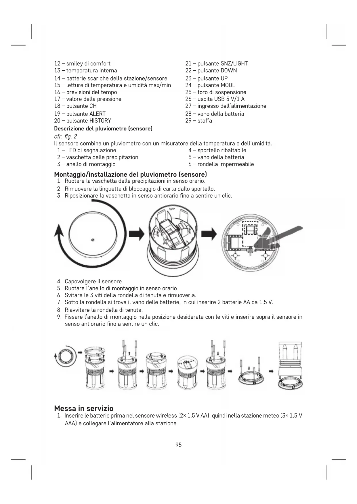 h – ora – minuto – anno – mese – giorno. Premere MODE per scorrere i valori, impostare con i pulsanti UP/DOWN. La lingua del calendario è l’inglese. Impostazione dell’unità di misura della temperatura °C/°F Premere ripetutamente il pulsante UP per impostare l’unità di misura della temperatura °C/°F. Impostazione dell’unità di pressione/precipitazioni Premere ripetutamente il pulsante DOWN per impostare l’unità di misura della pressione e delle precipitazioni inHg/inches oppure hPa/mm. Pressione atmosferica Nel campo 17 viene visualizzato il valore della pressione corrente. Premere ripetutamente il pulsante DOWN per impostare l’unità di misura della pressione inHg o hPa. Se la stazione meteo viene spostata in un altro luogo, i valori misurati ne risentiranno. Le misure si stabilizzano entro 12 ore dall’inserimento o dal riposizionamento della batteria. Icona comfort – smiley Viene visualizzato nel campo 12. Ambiente confortevole Ambiente confortevole Ambiente secco Ambiente secco Ambiente umido Tendenza della temperatura e dell’umidità Indicatore della tendenza della temperatura e dell’umidità crescente stabile calante Tendenza meteo Indicatore della tendenza meteo miglioramento invariato peggioramento Visualizzazione delle precipitazioni misurate e dei valori max/min della temperatura e dell’umidità La visualizzazione predenita delle precipitazioni è quella del giorno corrente (today’s). Premere ripetutamente il pulsante HISTORY per visualizzare gradualmente: Quantità di precipitazioni – ieri (yesterday), questa settimana (this week), questo mese (this month), questo anno (this year), anno scorso (last year), valori max/min della temperatura/umidità interna, valori max/min della temperatura/umidità esterna. Nota: Per cancellare manualmente la memoria dei valori misurati della temperatura e dell’umidità premere a lungo il pulsante HISTORY quando è visualizzata la cronologia delle misurazioni. Una volta superato il valore max. di precipitazioni di 999,99 mm compare 10.XX e la cronologia delle misurazioni deve essere cancellata.98 Per cancellare la cronologia delle precipitazioni misurate è necessario scollegare la fonte di ali- mentazione/estrarre le batterie dalla stazione meteo (la stazione meteo deve essere reimpostata manualmente). Nota sui valori misurati delle precipitazioni: Pioggia ne = 0,25 mm/ora Pioggia leggera = 1 mm/ora Pioggia = 4 mm/ora Pioggia intensa = 16 mm/ora Temporale = 35 mm/ora Temporale intenso = 100 mm/ora Cronologia graca della pressione / temperatura esterna / umidità esterna misurate Nel campo 3 è visualizzato il graco della misurazione della cronologia di pressione / temperatura esterna / umidità esterna no a 12 ore prima. Il graco è animato – i valori vengono visualizzati automaticamente e ripetutamente ogni 5 secondi. Non è possibile disattivare l’animazione, né modicare l’ordine/impostazione dei valori. Per cancellare la cronologia delle misurazioni è necessario scollegare la fonte di alimentazione/ estrarre le batterie dalla stazione meteo (la stazione meteo deve essere reimpostata manualmente). Impostazione della sveglia Premere il pulsante MODE – viene visualizzato AL. Quindi premere di nuovo il pulsante MODE, l’impostazione dell’ora inizierà a lampeggiare. Utilizzare i pulsanti UP/DOWN per impostare l’orario della sveglia. Confermare il valore impostato con il tasto MODE. Per attivare la sveglia, premere di nuovo il pulsante MODE (in gura AL) e quindi il pulsante UP/DOWN. La visualizzazione dell’icona signica che la sveglia è attivata. Per disattivare la sveglia premere ancora il pulsante UP/DOWN – l’icona non verrà visualizzata. Funzione di sveglia ripetuta Per ritardare la suoneria della sveglia di 5 minuti, utilizzare il pulsante SNZ/LIGHT posizionato sulla parte superiore della stazione meteo. Premerlo non appena inizia a suonare. L’icona lampeggerà. Per annullare la funzione SNOOZE, premere qualsiasi altro pulsante mentre è attiva la suoneria – l’icona smetterà di lampeggiare e rimarrà visualizzata l’icona . La sveglia si riattiverà il giorno successivo. Retroilluminazione del display della stazione