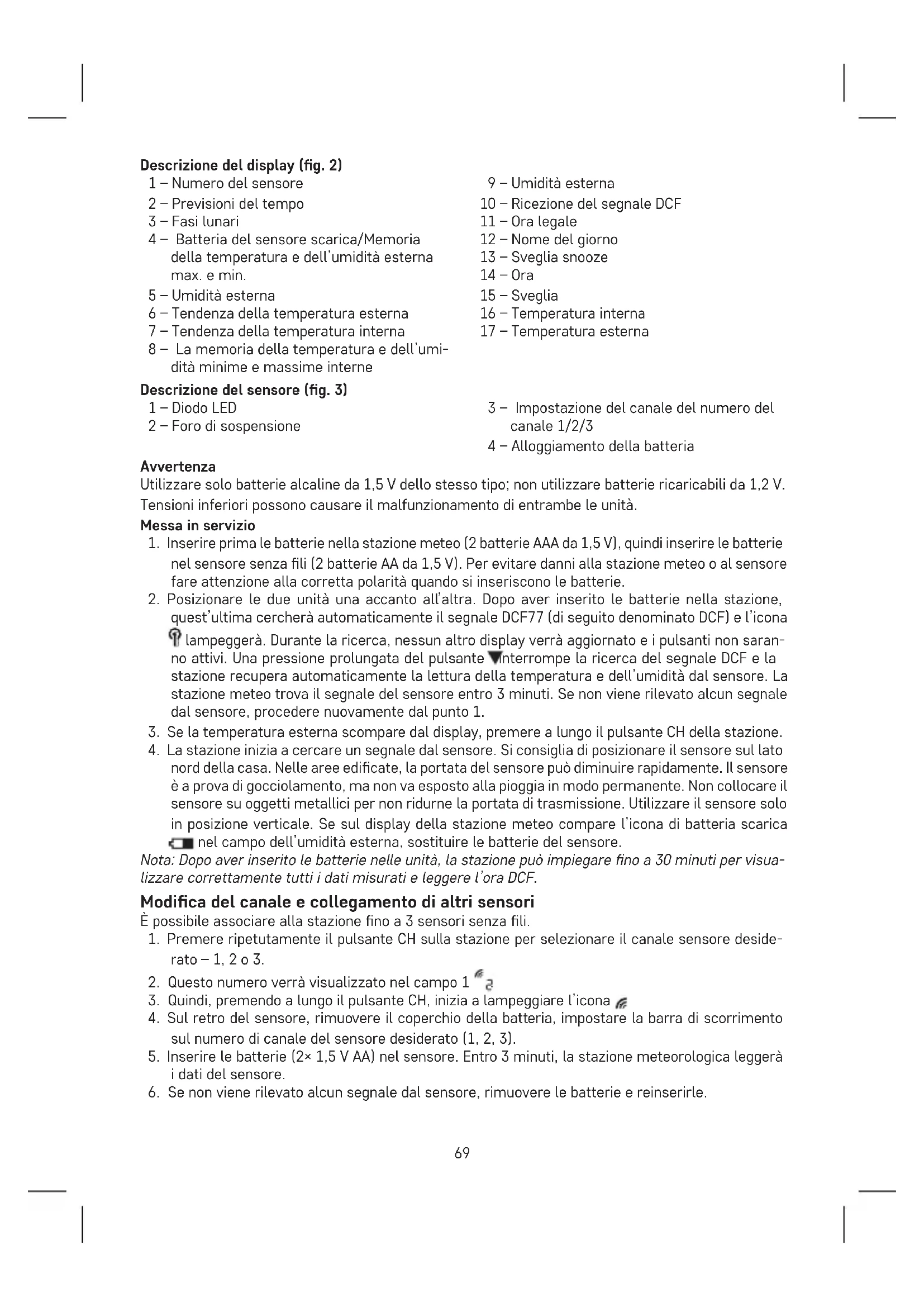 nord della casa. Nelle aree edicate, la portata del sensore può diminuire rapidamente. Il sensore è a prova di gocciolamento, ma non va esposto alla pioggia in modo permanente. Non collocare il sensore su oggetti metallici per non ridurne la portata di trasmissione. Utilizzare il sensore solo in posizione verticale. Se sul display della stazione meteo compare l’icona di batteria scarica nel campo dell’umidità esterna, sostituire le batterie del sensore. Nota: Dopo aver inserito le batterie nelle unità, la stazione può impiegare no a 30 minuti per visua- lizzare correttamente tutti i dati misurati e leggere l’ora DCF. Modica del canale e collegamento di altri sensori È possibile associare alla stazione no a 3 sensori senza li.