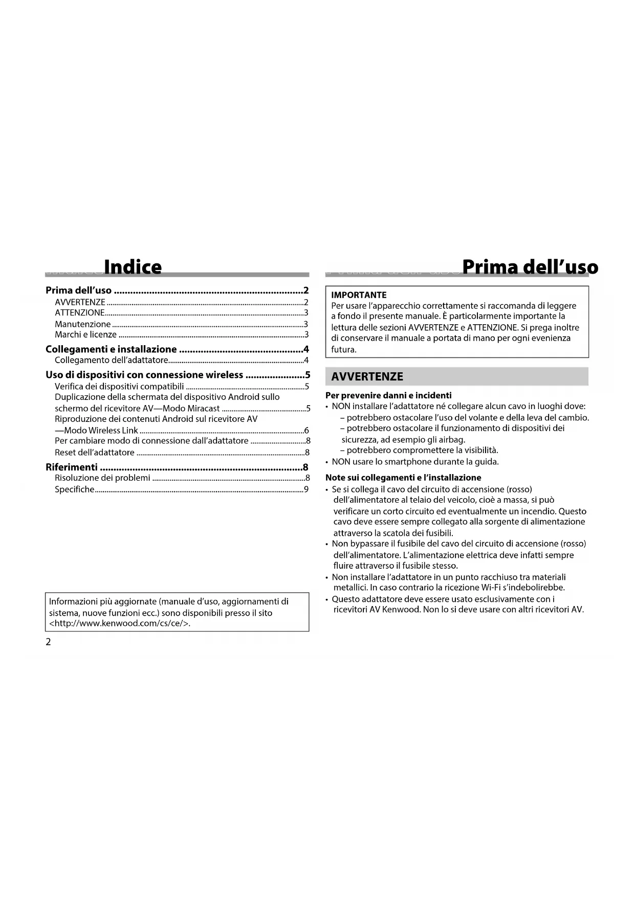 - Questo adattatore deve essere usato esclusivamente con i ricevitori AV Kenwood. Non lo si deve usare con altri ricevitori AV. IndiceIndice Prima dell’uso ......................................................................2 AVVERTENZE .......................................................................................................2 ATTENZIONE ........................................................................................................3 Manutenzione ....................................................................................................3 Marchi e licenze .................................................................................................3 Collegamenti e installazione ..............................................4 Collegamento dell’adattatore.......................................................................4 Uso di dispositivi con connessione wireless ......................5 Verifica dei dispositivi compatibili ..............................................................5 Duplicazione della schermata del dispositivo Android sullo schermo del ricevitore AV—Modo Miracast ............................................5 Riproduzione dei contenuti Android sul ricevitore AV —Modo Wireless Link ......................................................................................6 Per cambiare modo di connessione dall’adattatore .............................8 Reset dell’adattatore ........................................................................................8 Riferimenti ...........................................................................8 Risoluzione dei problemi ................................................................................8 Specifiche ............................................................................................................. 9 Informazioni più aggiornate (manuale d’uso, aggiornamenti di sistema, nuove funzioni ecc.) sono disponibili presso il sito <http://www.kenwood.com/cs/ce/>. BookENKCA-WL100W.indb2Book EN KCA WL100 W indb 2 2015/06/2511:292015/06/25 11:29ITALIANO 3 Prima dell’usoPrima dell’uso ATTENZIONE Note sui collegamenti e l’installazione