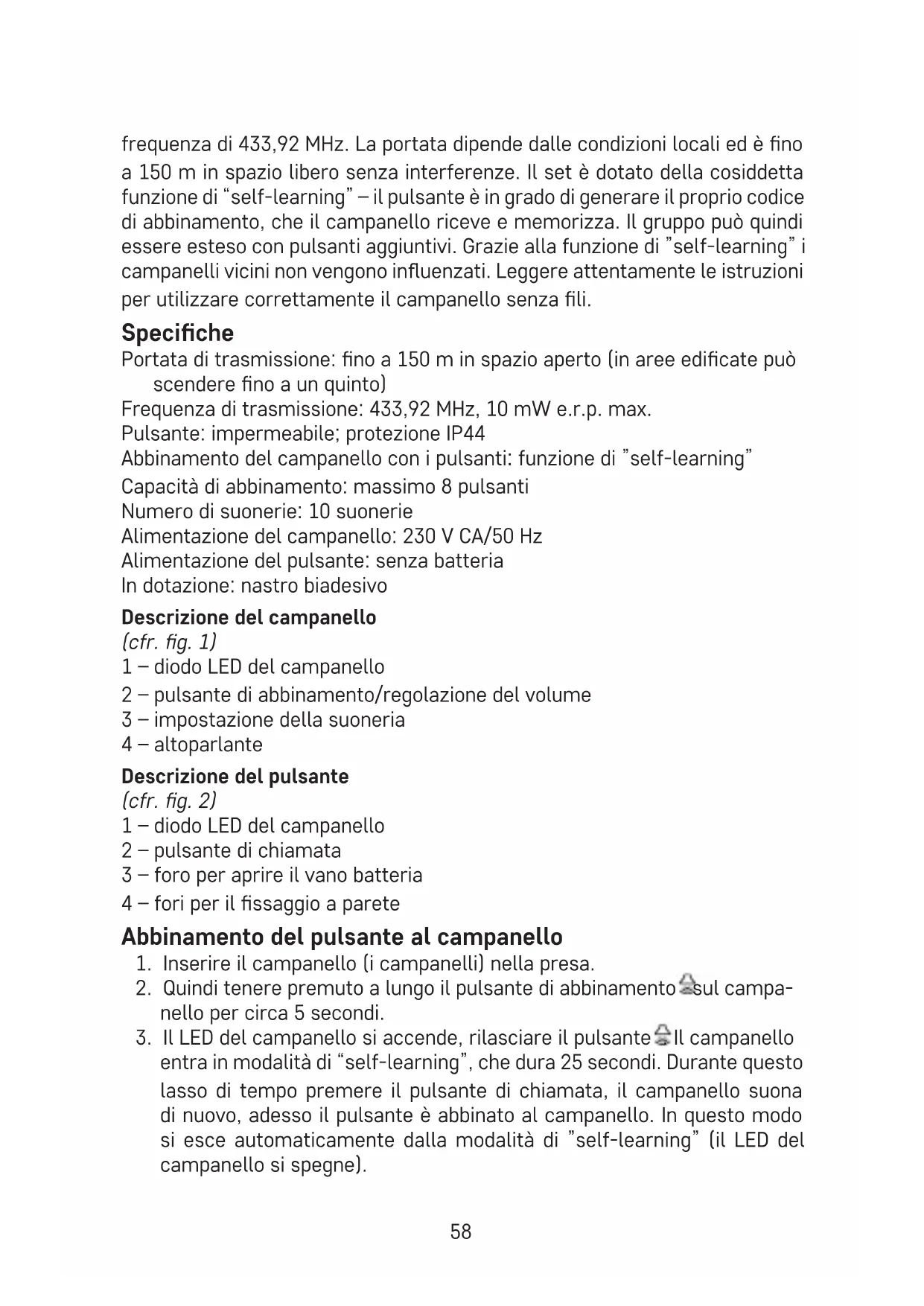entra in modalità di “self-learning”, che dura 25 secondi. Durante questo lasso di tempo premere il pulsante di chiamata, il campanello suona di nuovo, adesso il pulsante è abbinato al campanello. In questo modo si esce automaticamente dalla modalità di ”self-learning” (il LED del campanello si spegne).59