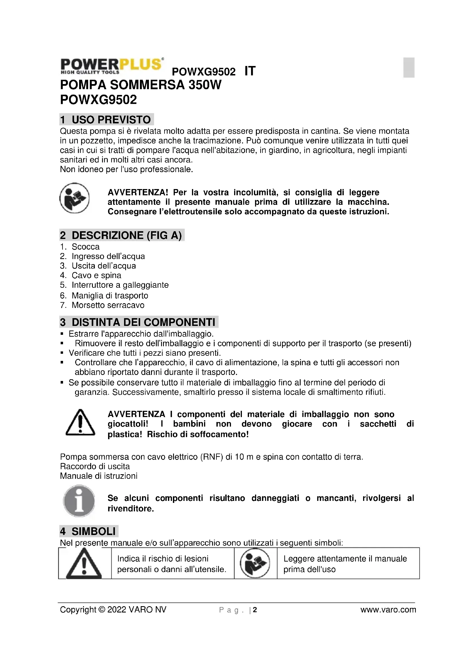 Leggere attentamente il manuale prima dell'usoPOWXG9502 IT Copyright © 2022 VARO NV P a g . | 3 www.varo.com