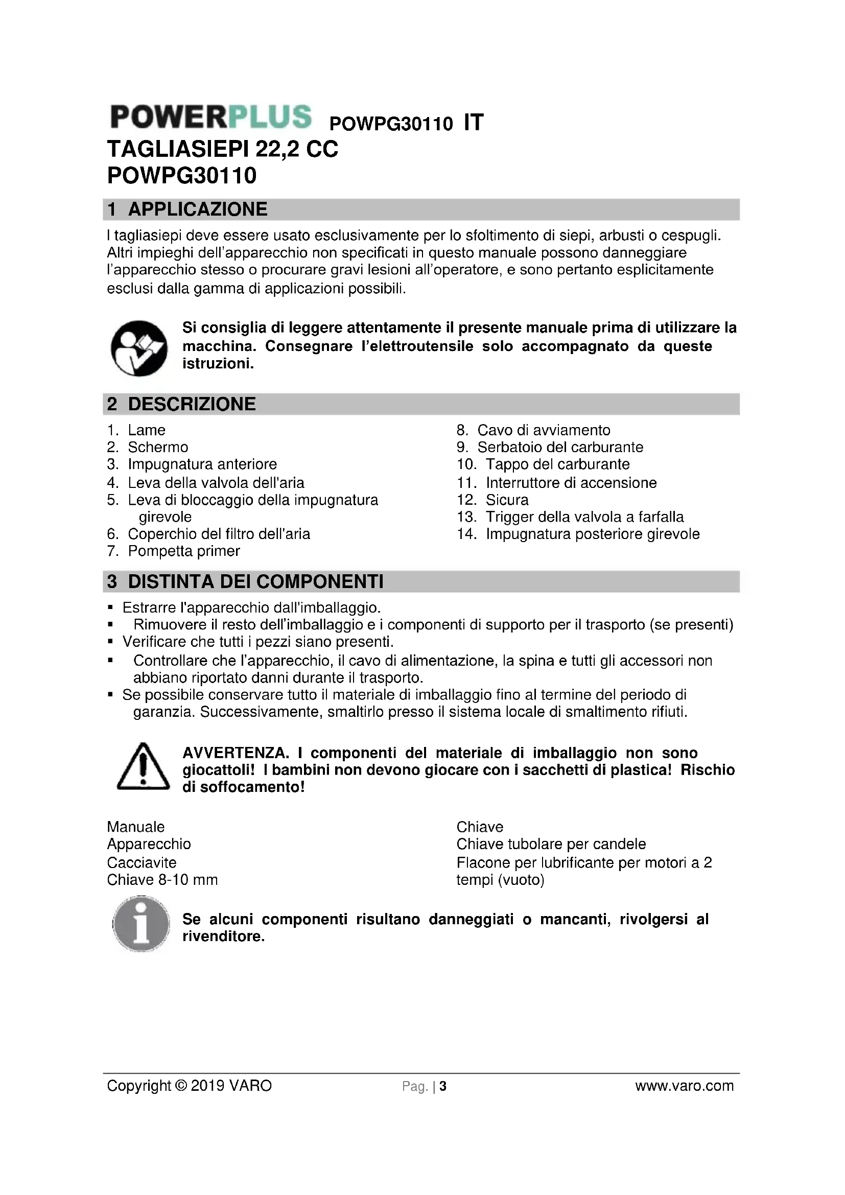 Copyright © 2019 VARO Pag. | 3 www.varo.com TAGLIASIEPI 22,2 CC POWPG30110 1 APPLICAZIONE l tagliasiepi deve essere usato esclusivamente per lo sfoltimento di siepi, arbusti o cespugli. Altri impieghi dell’apparecchio non specificati in questo manuale possono danneggiare l’apparecchio stesso o procurare gravi lesioni all’operatore, e sono pertanto esplicitamente esclusi dalla gamma di applicazioni possibili. Si consiglia di leggere attentamente il presente manuale prima di utilizzare la macchina. Consegnare l’elettroutensile solo accompagnato da queste istruzioni. 2 DESCRIZIONE