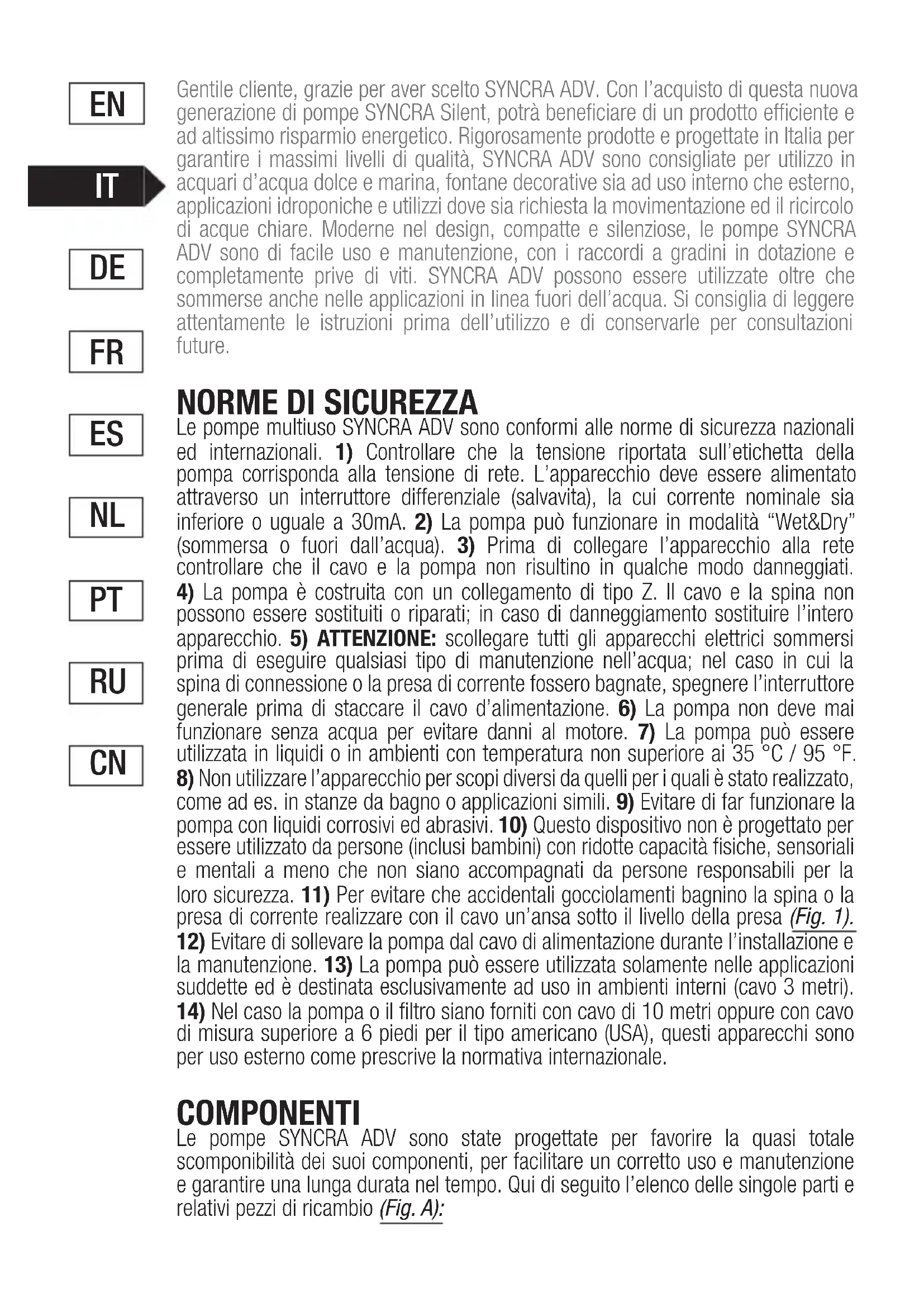 di misura superiore a 6 piedi per il tipo americano (USA), questi apparecchi sono per uso esterno come prescrive la normativa internazionale. COMPONENTI Le pompe SYNCRA ADV sono state progettate per favorire la quasi totale scomponibilità dei suoi componenti, per facilitare un corretto uso e manutenzione e garantire una lunga durata nel tempo. Qui di seguito l’elenco delle singole parti e relativi pezzi di ricambio (Fig. A):