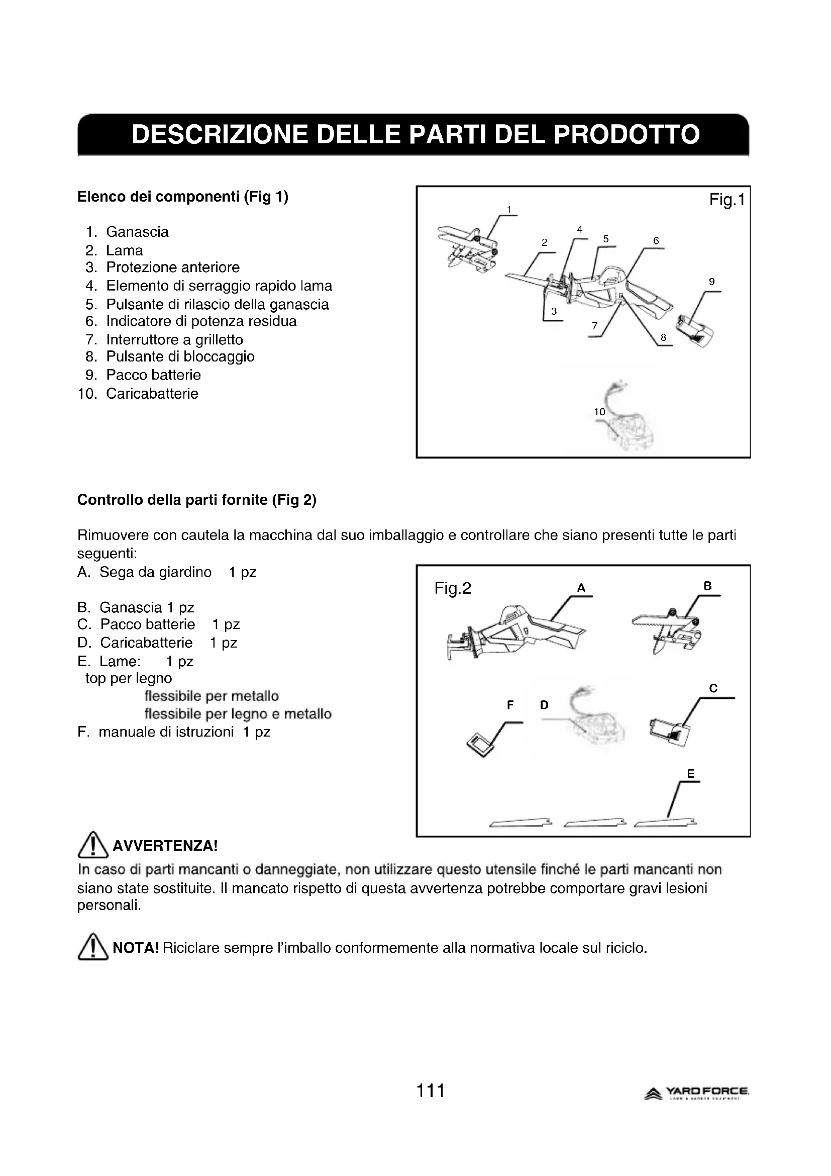 Controllo della parti fornite (Fig 2) Rimuovere con cautela la macchina dal suo imballaggio e controllare che siano presenti tutte le parti seguenti: A. Sega da giardino 1 pz B. Ganascia 1 pz C. Pacco batterie 1 pz D. Caricabatterie 1 pz E. Lame: 1 pz top per legno