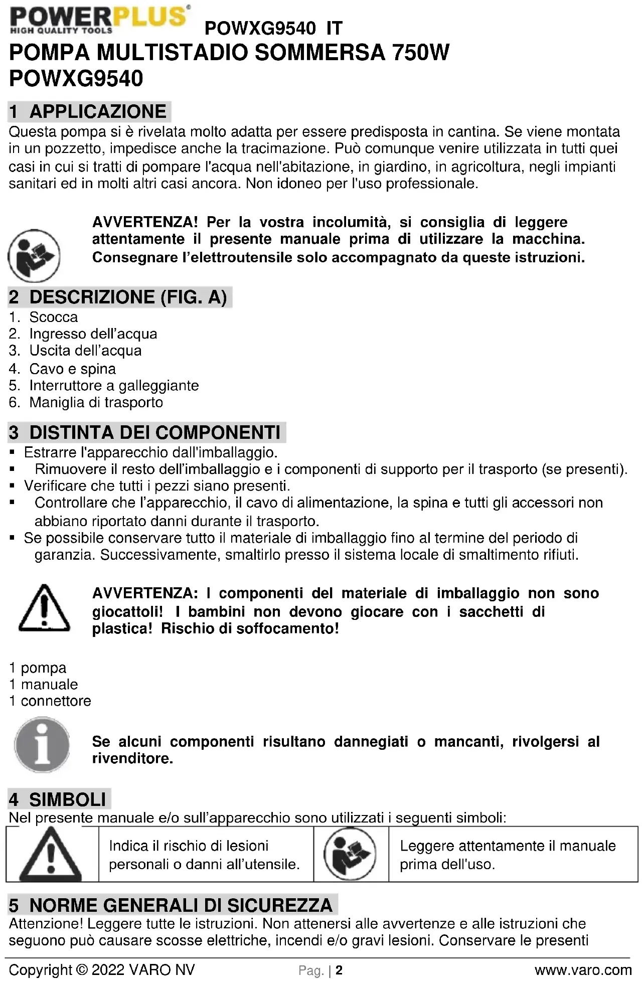 POWXG9540 1 APPLICAZIONE Questa pompa si è rivelata molto adatta per essere predisposta in cantina. Se viene montata in un pozzetto, impedisce anche la tracimazione. Può comunque venire utilizzata in tutti quei casi in cui si tratti di pompare l'acqua nell'abitazione, in giardino, in agricoltura, negli impianti sanitari ed in molti altri casi ancora. Non idoneo per l'uso professionale. AVVERTENZA! Per la vostra incolumità, si consiglia di leggere attentamente il presente manuale prima di utilizzare la macchina. Consegnare l’elettroutensile solo accompagnato da queste istruzioni. 2 DESCRIZIONE (FIG. A)
