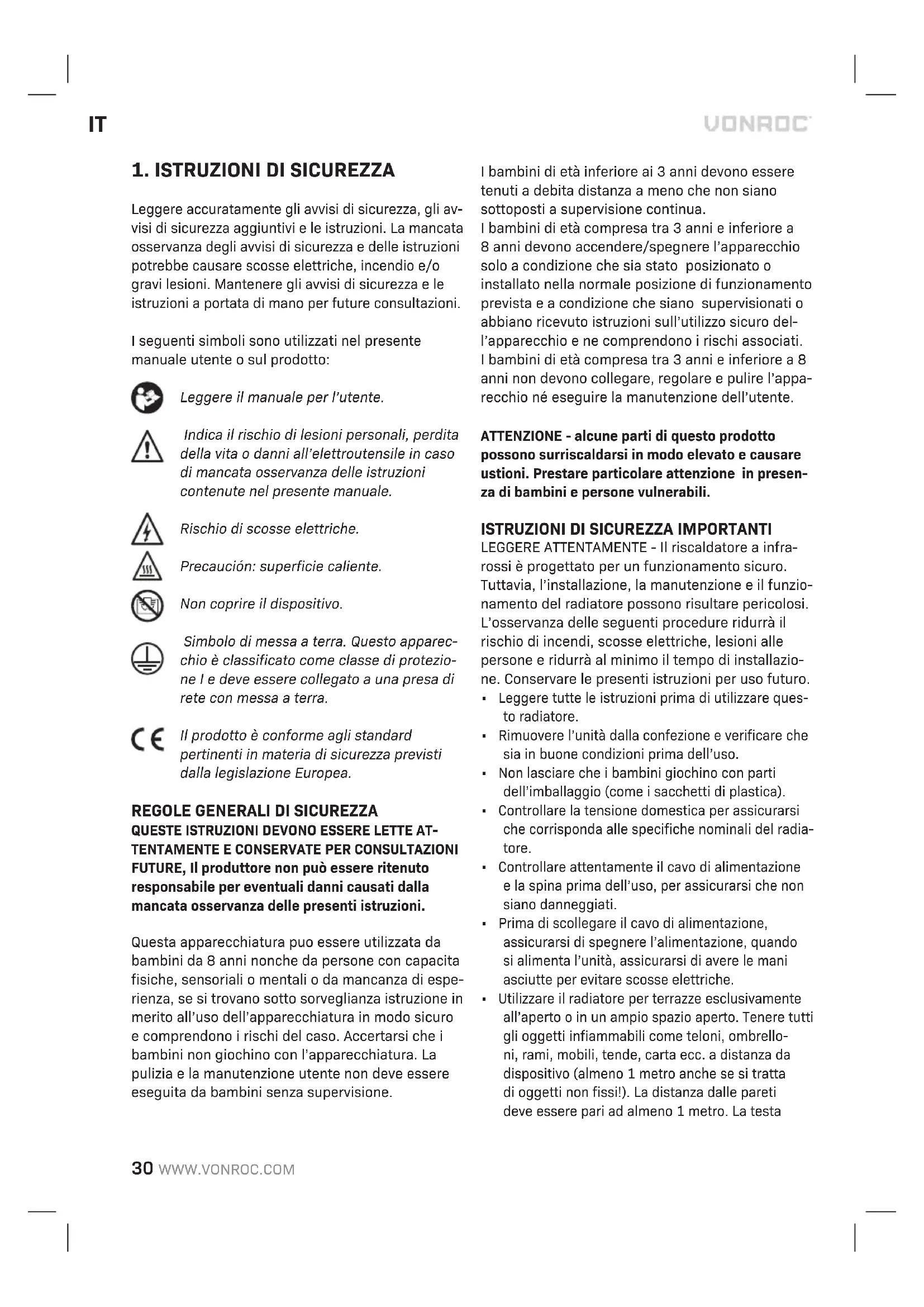 LEGGERE ATTENTAMENTE - Il riscaldatore a infra- rossi è progettato per un funzionamento sicuro. Tuttavia, l’installazione, la manutenzione e il funzio- namento del radiatore possono risultare pericolosi. L’osservanza delle seguenti procedure ridurrà il rischio di incendi, scosse elettriche, lesioni alle persone e ridurrà al minimo il tempo di installazio- ne. Conservare le presenti istruzioni per uso futuro.