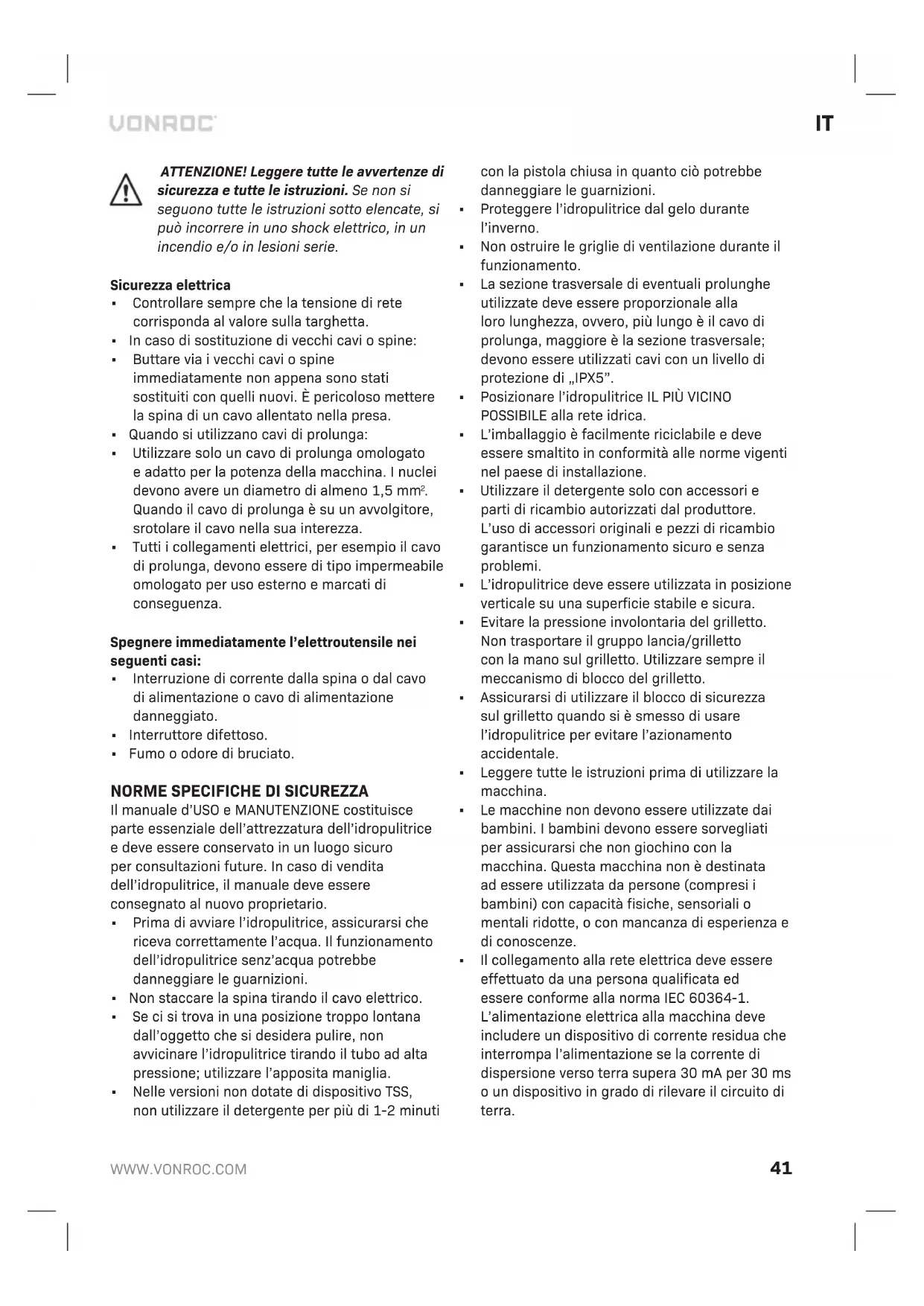 - I getti ad alta pressione possono essere pericolosi se sottoposti a uso improprio. Il getto non deve essere diretto verso persone, animali, apparecchiature elettriche in tensione o verso la macchina stessa. Le idropulitrici non devono essere puntate ai fianchi dei pneumatici, in quanto è possibile danneggiarli.
