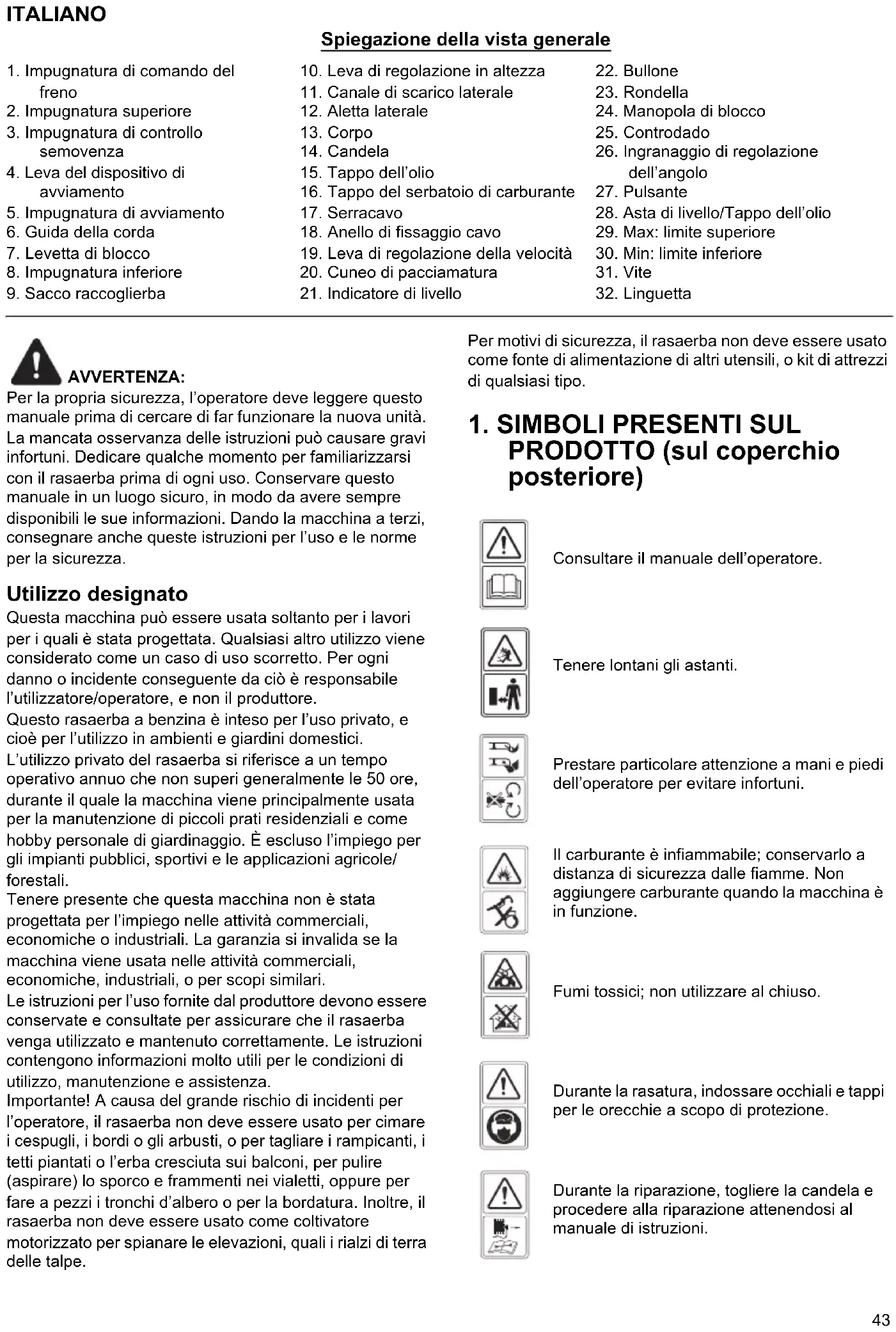 Nur für europäische Länder Die EG-Konformitätserklärung ist als Anhang A in dieser Bedienungsanleitung enthalten.43 ITALIANO Spiegazione della vista generale AVVERTENZA: Per la propria sicurezza, l’operatore deve leggere questo manuale prima di cercare di far funzionare la nuova unità. La mancata osservanza delle istruzioni può causare gravi infortuni. Dedicare qualche momento per familiarizzarsi con il rasaerba prima di ogni uso. Conservare questo manuale in un luogo sicuro, in modo da avere sempre disponibili le sue informazioni. Dando la macchina a terzi, consegnare anche queste istruzioni per l’uso e le norme per la sicurezza. Utilizzo designato Questa macchina può essere usata soltanto per i lavori per i quali è stata progettata. Qualsiasi altro utilizzo viene considerato come un caso di uso scorretto. Per ogni danno o incidente conseguente da ciò è responsabile l’utilizzatore/operatore, e non il produttore. Questo rasaerba a benzina è inteso per l’uso privato, e cioè per l’utilizzo in ambienti e giardini domestici. L’utilizzo privato del rasaerba si riferisce a un tempo operativo annuo che non superi generalmente le 50 ore, durante il quale la macchina viene principalmente usata per la manutenzione di piccoli prati residenziali e come hobby personale di giardinaggio. È escluso l’impiego per gli impianti pubblici, sportivi e le applicazioni agricole/ forestali. Tenere presente che questa macchina non è stata progettata per l’impiego nelle attività commerciali, economiche o industriali. La garanzia si invalida se la macchina viene usata nelle attività commerciali, economiche, industriali, o per scopi similari. Le istruzioni per l’uso fornite dal produttore devono essere conservate e consultate per assicurare che il rasaerba venga utilizzato e mantenuto correttamente. Le istruzioni contengono informazioni molto utili per le condizioni di utilizzo, manutenzione e assistenza. Importante! A causa del grande rischio di incidenti per l’operatore, il rasaerba non deve essere usato per cimare i cespugli, i bordi o gli arbusti, o per tagliare i rampicanti, i tetti piantati o l’erba cresciuta sui balconi, per pulire (aspirare) lo sporco e frammenti nei vialetti, oppure per fare a pezzi i tronchi d’albero o per la bordatura. Inoltre, il rasaerba non deve essere usato come coltivatore motorizzato per spianare le elevazioni, quali i rialzi di terra delle talpe. Per motivi di sicurezza, il rasaerba non deve essere usato come fonte di alimentazione di altri utensili, o kit di attrezzi di qualsiasi tipo.