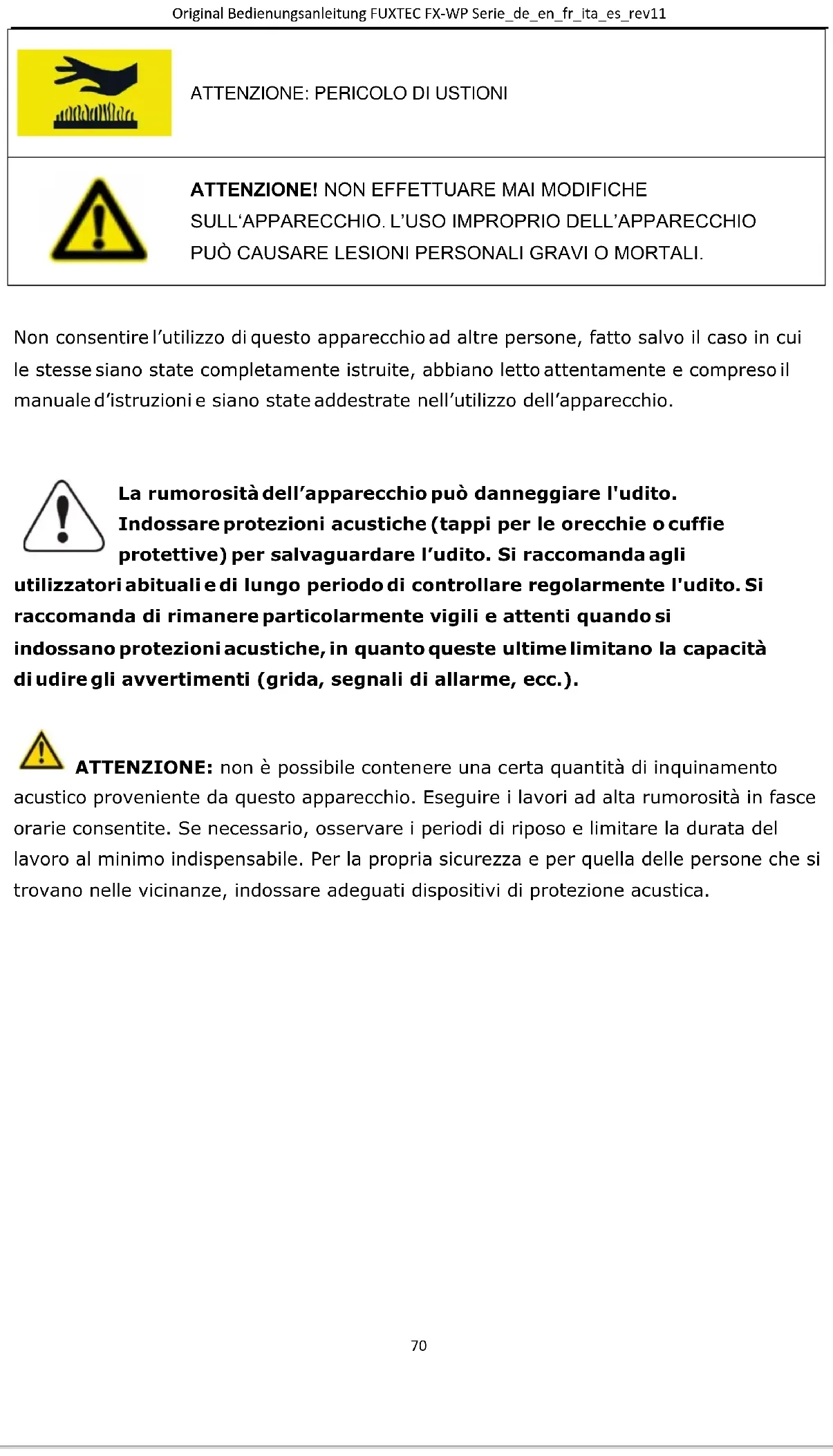 La rumorosità dell’apparecchio può danneggiare l'udito. Indossare protezioni acustiche (tappi per le orecchie o cuffie protettive) per salvaguardare l’udito. Si raccomanda agli utilizzatori abituali e di lungo periodo di controllare regolarmente l'udito. Si raccomanda di rimanere particolarmente vigili e attenti quando si indossano protezioni acustiche, in quanto queste ultime limitano la capacità di udire gli avvertimenti (grida, segnali di allarme, ecc.). ATTENZIONE: non è possibile contenere una certa quantità di inquinamento acustico proveniente da questo apparecchio. Eseguire i lavori ad alta rumorosità in fasce orarie consentite. Se necessario, osservare i periodi di riposo e limitare la durata del lavoro al minimo indispensabile. Per la propria sicurezza e per quella delle persone che si trovano nelle vicinanze, indossare adeguati dispositivi di protezione acustica.Original Bedienungsanleitung FUXTEC FX-WP Serie_de_en_fr_ita_es_rev11