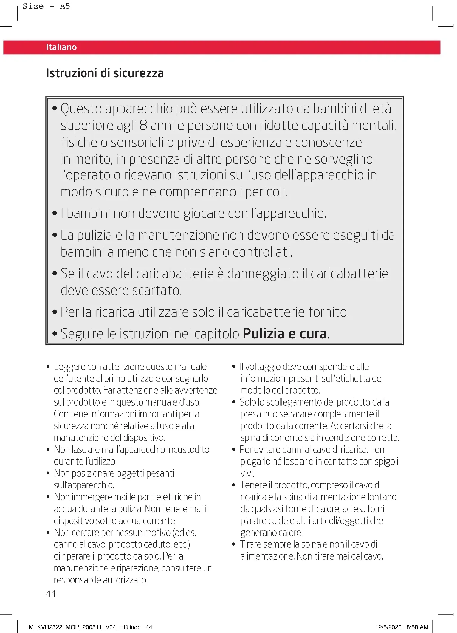 - Tirare sempre la spina e non il cavo di alimentazione. Non tirare mai dal cavo. IM_KVR25221MOP_200511_V04_HR.indb 44IM_KVR25221MOP_200511_V04_HR.indb 44 12/5/2020 8:58 AM12/5/2020 8:58 AMItaliano