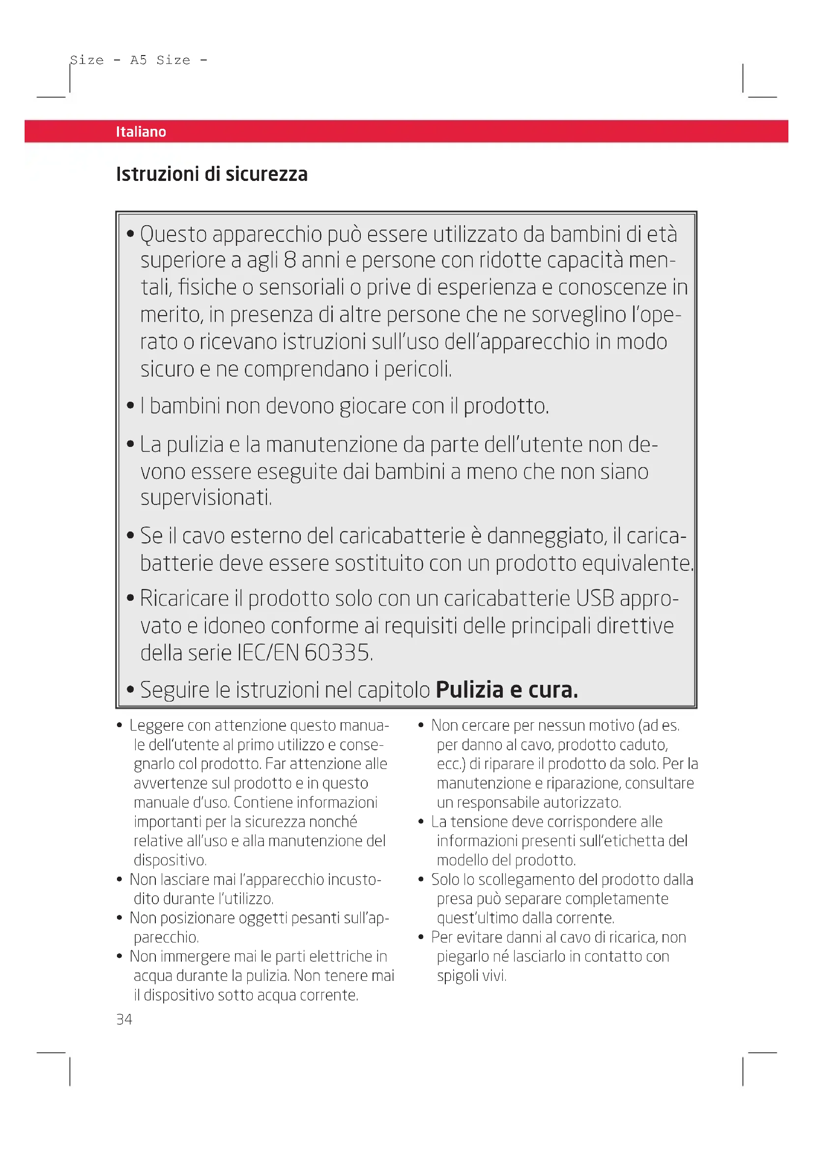 - Ricaricare il prodotto solo con un caricabatterie USB appro- vato e idoneo conforme ai requisiti delle principali direttive della serie IEC/EN 60335.