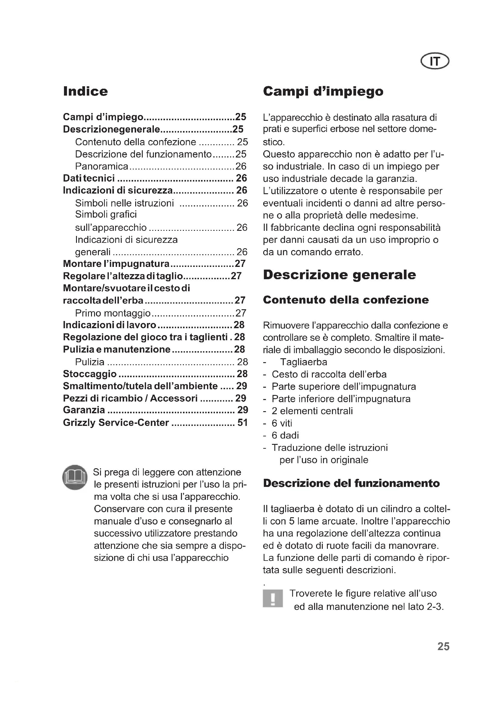 - L’erba tagliata non deve essere intro- dotta nel cassonetto, ma nel compo- sto oppure distribuita come strato di pacciame sotto ai cespugli e gli alberi Pezzi di ricambio / Accessori È possibile ordinare pezzi di ricambio e accessori all’indirizzo www.grizzly-service.eu Se non si dispone di una connessione In- ternet, contattare telefonicamente il centro di assistenza (vedere “Service-Center”). Garanzia L’apparecchio è coperto da garanzia di 24 mesi. L’apparecchio è coperto da garanzia di 24 mesi. Per l’impiego industriale e apparec- chi sostituiti, la garanzia ha un periodo di validità inferiore. La garanzia non copre eventuali danni riconducibili al normale utilizzo del prodot- to, al sovraccarico o all’impiego scorretto. Determinati componenti, come ad esem- pio il cilindro girevole, sostegno metallico inferiore, sono soggetti a normale usura e non sono dunque coperti dalla garanzia. Presupposto essenziale per la concessio- ne della garanzia è che vengano inoltre osservate le istruzioni per la pulizia e la manutenzione riportate nel manuale. I danni legati ad errori di produzione o ai materiali verranno risarciti attraverso la fornitura di ricambi o la riparazione, a patto che il prodotto venga riconsegnato al rivenditore assemblato e unitamente allo scontrino di acquisto e al certicato di garanzia. Eventuali riparazioni non coperte dalla garanzia potranno essere eseguite dal nostro centro di assistenza a pagamento. Il nostro centro di assistenza sarà lieto di presentarvi un preventivo dei costi di riparazione. Verranno eseguiti interventi esclusiva- mente sui prodotti inviati in un imballo adeguato e correttamente arancati. Attenzione: in caso di reclamo o di inter- vento di assistenza, si prega di inviare il prodotto pulito e con un’indicazione del di- fetto all’indirizzo del centro di assistenza. I prodotti inviati in porto assegnato – come merce ingombrante, per posta espressa o come spedizione speciale –, non verranno accettati Lo smaltimento degli apparecchio difettosi consegnati viene eettuato gratuitamente.30