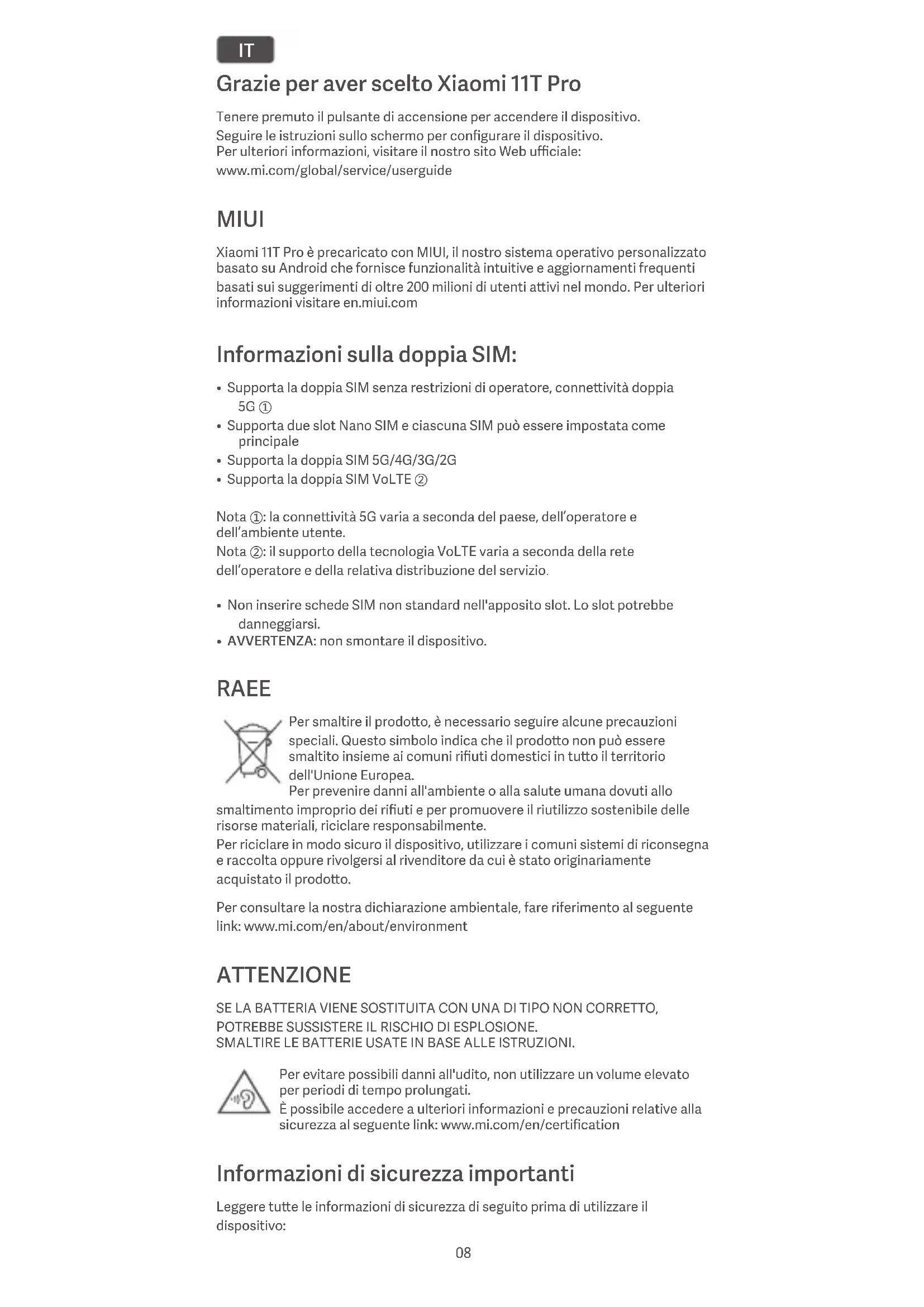 - AVVERTENZA: non smontare il dispositivo. RAEE Per smaltire il prodoo, è necessario seguire alcune precauzioni speciali. Questo simbolo indica che il prodoo non può essere smaltito insieme ai comuni rifiuti domestici in tuo il territorio dell'Unione Europea. Per prevenire danni all'ambiente o alla salute umana dovuti allo smaltimento improprio dei rifiuti e per promuovere il riutilizzo sostenibile delle risorse materiali, riciclare responsabilmente. Per riciclare in modo sicuro il dispositivo, utilizzare i comuni sistemi di riconsegna e raccolta oppure rivolgersi al rivenditore da cui è stato originariamente acquistato il prodoo. Per consultare la nostra dichiarazione ambientale, fare riferimento al seguente link: www.mi.com/en/about/environment ATTENZIONE SE LA BATTERIA VIENE SOSTITUITA CON UNA DI TIPO NON CORRETTO, POTREBBE SUSSISTERE IL RISCHIO DI ESPLOSIONE. SMALTIRE LE BATTERIE USATE IN BASE ALLE ISTRUZIONI. Per evitare possibili danni all'udito, non utilizzare un volume elevato per periodi di tempo prolungati. È possibile accedere a ulteriori informazioni e precauzioni relative alla sicurezza al seguente link: www.mi.com/en/certification Informazioni di sicurezza importanti Leggere tue le informazioni di sicurezza di seguito prima di utilizzare il dispositivo: 08• L'uso di cavi, alimentatori o baerie non autorizzati può provocare incendi, esplosioni o comportare altri rischi.