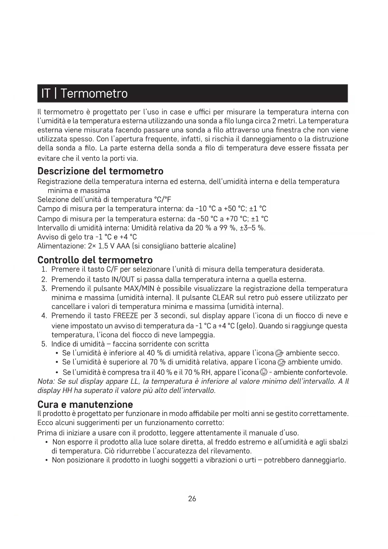 - Se l‘umidità è compresa tra il 40 % e il 70 % RH, appare l‘icona - ambiente confortevole. Nota: Se sul display appare LL, la temperatura è inferiore al valore minimo dell‘intervallo. A Il display HH ha superato il valore più alto dell‘intervallo. Cura e manutenzione Il prodotto è progettato per funzionare in modo adabile per molti anni se gestito correttamente. Ecco alcuni suggerimenti per un funzionamento corretto: Prima di iniziare a usare con il prodotto, leggere attentamente il manuale d’uso.