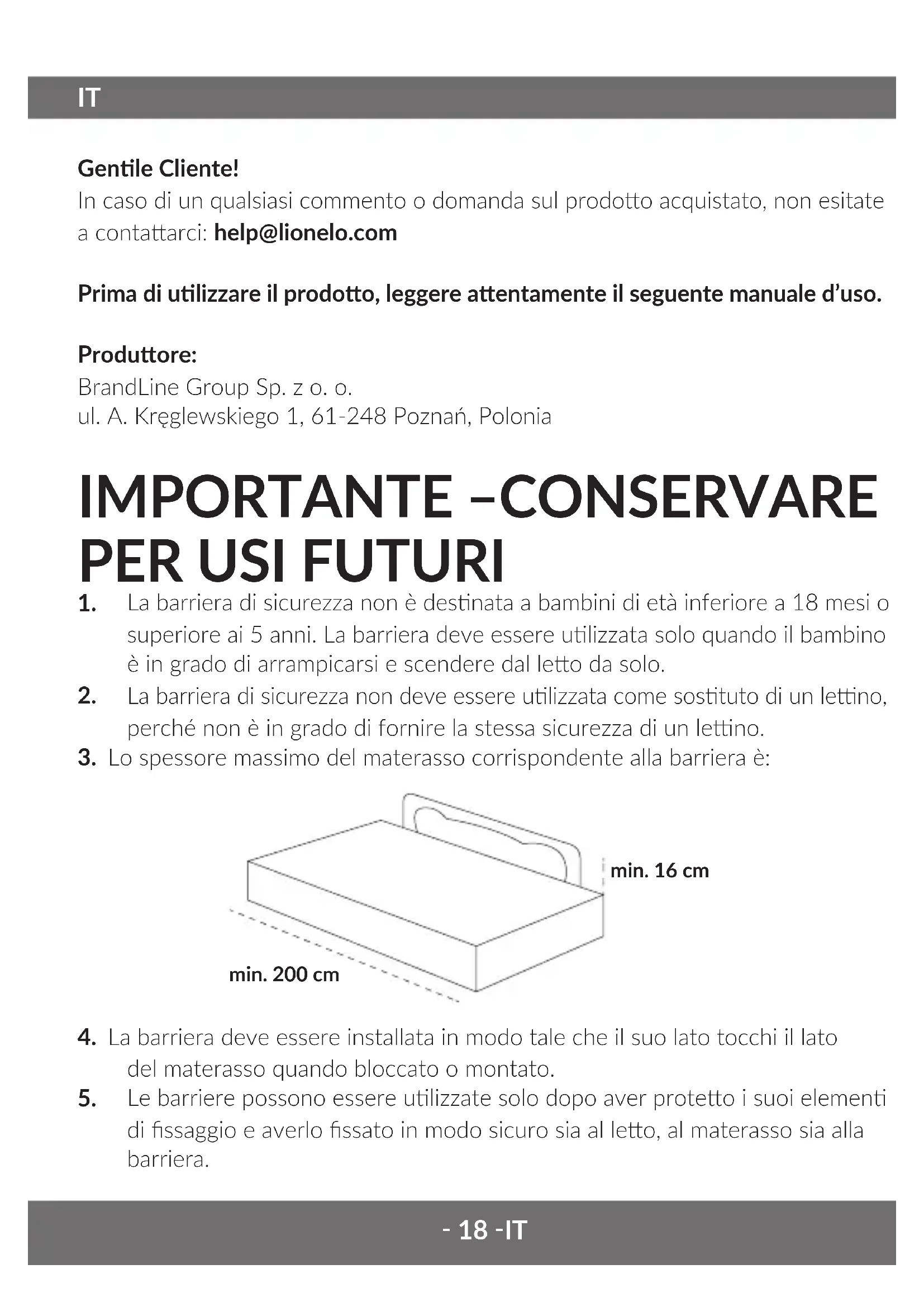 Allacciare la cintura di protezione e posizionare la punta tra il leo e il materasso, quindi stringere la cintura con la regolazione (g. 10, 11). Pulizia e lavaggio Per pulire il rivesmento in tessuto, smontare i tubi ed estrarli dalla base. Rimuovere la fodera in tessuto. Lavare a mano, non srare, non asciugare in asciugatrice. Il prodoo è stato testato e soddisfa tu requisi della norma BS 7972:2001 +A1:2009, EN 71-3:2019 Le immagini ulizzate nel manuale sono illustrave e possono essere modicate senza necessità informare l’utente. Le informazioni contenute in questo manuale sono soggee a modiche senza necessità informare l’utente.‑ 21 ‑ FR Cher client! Si vous avez des quesons ou remarques relaves au produit acheté, n’hésitez pas à nous contacter à l’adresse: help@lionelo.com Avant d’uliser le produit pour la première fois, lisez aenvement ce mode d’emploi. Producteur: BrandLine Group Sp. z o. o. ul. A. Kręglewskiego 1, 61-248 Poznań, Pologne