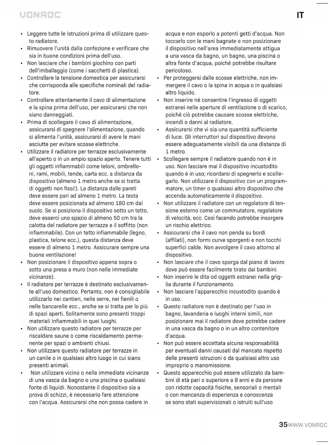 LEGGERE ATTENTAMENTE - Il riscaldatore a infra- rossi è progettato per un funzionamento sicuro. Tuttavia, l’installazione, la manutenzione e il funzio- namento del radiatore possono risultare pericolosi. L’osservanza delle seguenti procedure ridurrà il rischio di incendi, scosse elettriche, lesioni alle persone e ridurrà al minimo il tempo di installazio- ne. Conservare le presenti istruzioni per uso futuro.IT