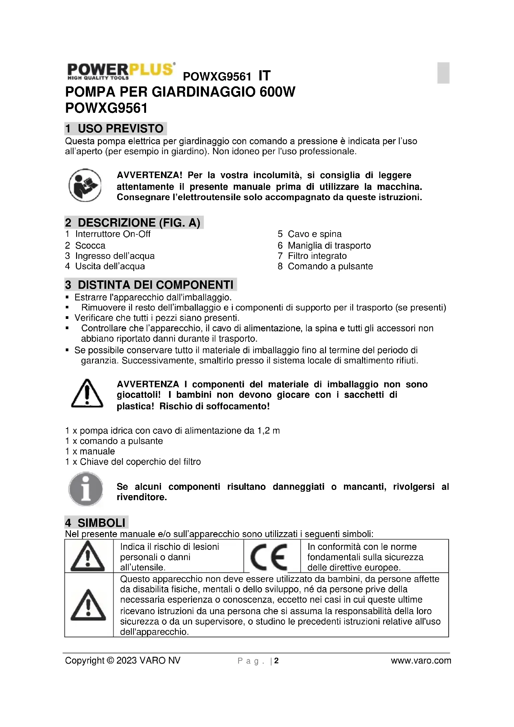 POWXG9561 1 USO PREVISTO Questa pompa elettrica per giardinaggio con comando a pressione è indicata per l’uso all’aperto (per esempio in giardino). Non idoneo per l'uso professionale. AVVERTENZA! Per la vostra incolumità, si consiglia di leggere attentamente il presente manuale prima di utilizzare la macchina. Consegnare l’elettroutensile solo accompagnato da queste istruzioni. 2 DESCRIZIONE (FIG. A) 1 Interruttore On-Off 2 Scocca 3 Ingresso dell’acqua 4 Uscita dell’acqua 5 Cavo e spina 6 Maniglia di trasporto 7 Filtro integrato 8 Comando a pulsante