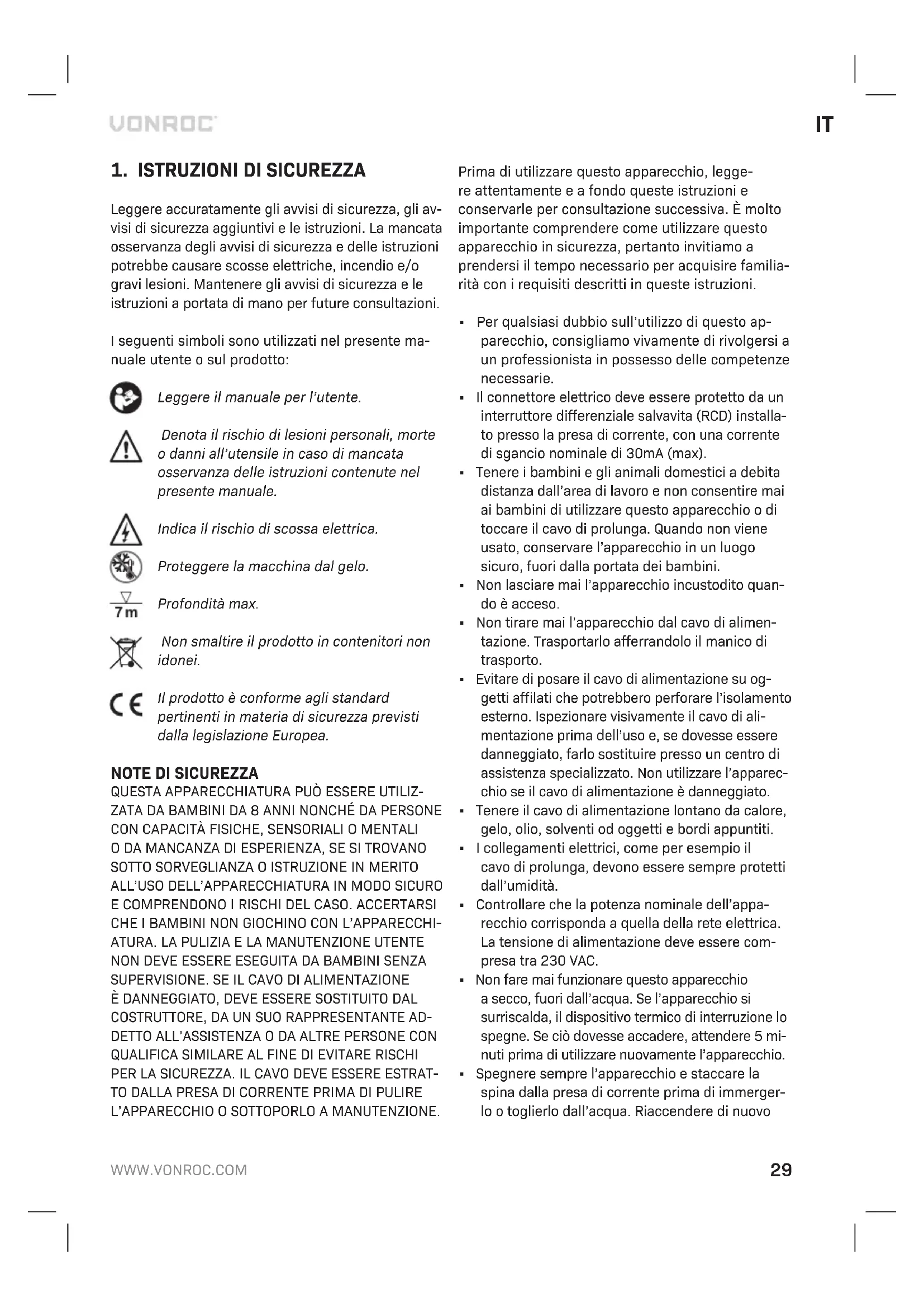 - Sono state utilizzate parti di ricambio non origi- nali. Ciò costituisce l’unica garanzia espressa o implicita fornita dall’azienda. Non esistono altre garanzie es- presse o implicite che si estendono oltre il presente documento, ivi comprese le garanzie implicite di commerciabilità e idoneità per uno scopo particola- re. In nessun caso VONROC sarà responsabile di eventuali danni incidentali o consequenziali. I rime- di dei rivenditori saranno limitati alla riparazione o sostituzione di unità o parti non conformi. Il prodotto e il manuale per l’utente sono soggetti a modifiche. I dati tecnici possono essere modificati senza ulteriore notifica.34