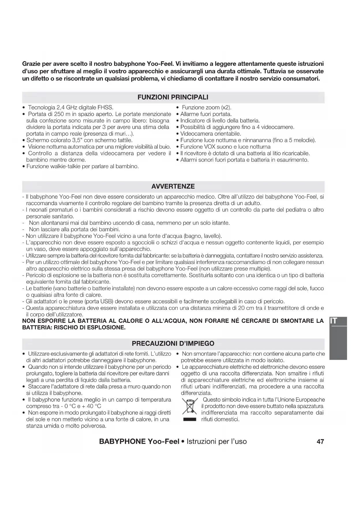 - Le apparecchiature elettriche ed elettroniche devono essere oggetto di una raccolta differenziata. Non smaltire i rifiuti di apparecchiature elettriche ed elettroniche insieme ai rifiuti urbani indifferenziati, ma procedere a una raccolta differenziata. Questo simbolo indica in tutta l’Unione Europeache il prodotto non deve essere buttato nella spazzatura indifferenziata ma raccolto separatamente dai rifiuti domestici. Grazie per avere scelto il nostro babyphone Yoo-Feel. Vi invitiamo a leggere attentamente queste istruzioni d’uso per sfruttare al meglio il vostro apparecchio e assicurargli una durata ottimale. Tuttavia se osservate un difetto o se riscontrate un qualsiasi problema, vi chiediamo di contattare il nostro servizio consumatori. BABYPHONE Yoo-Feel