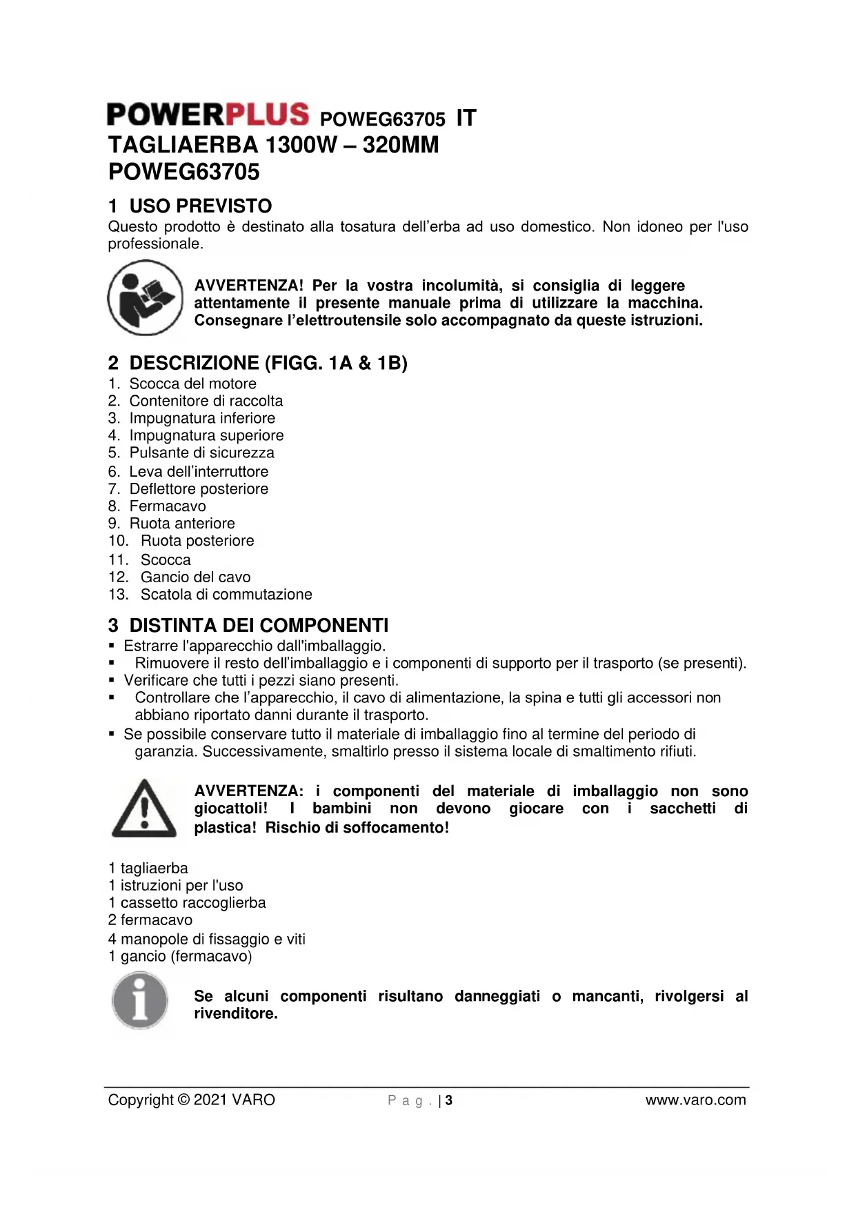 POWEG63705 1 USO PREVISTO Questo prodotto è destinato alla tosatura dell’erba ad uso domestico. Non idoneo per l'uso professionale. AVVERTENZA! Per la vostra incolumità, si consiglia di leggere attentamente il presente manuale prima di utilizzare la macchina. Consegnare l’elettroutensile solo accompagnato da queste istruzioni. 2 DESCRIZIONE (FIGG. 1A & 1B)