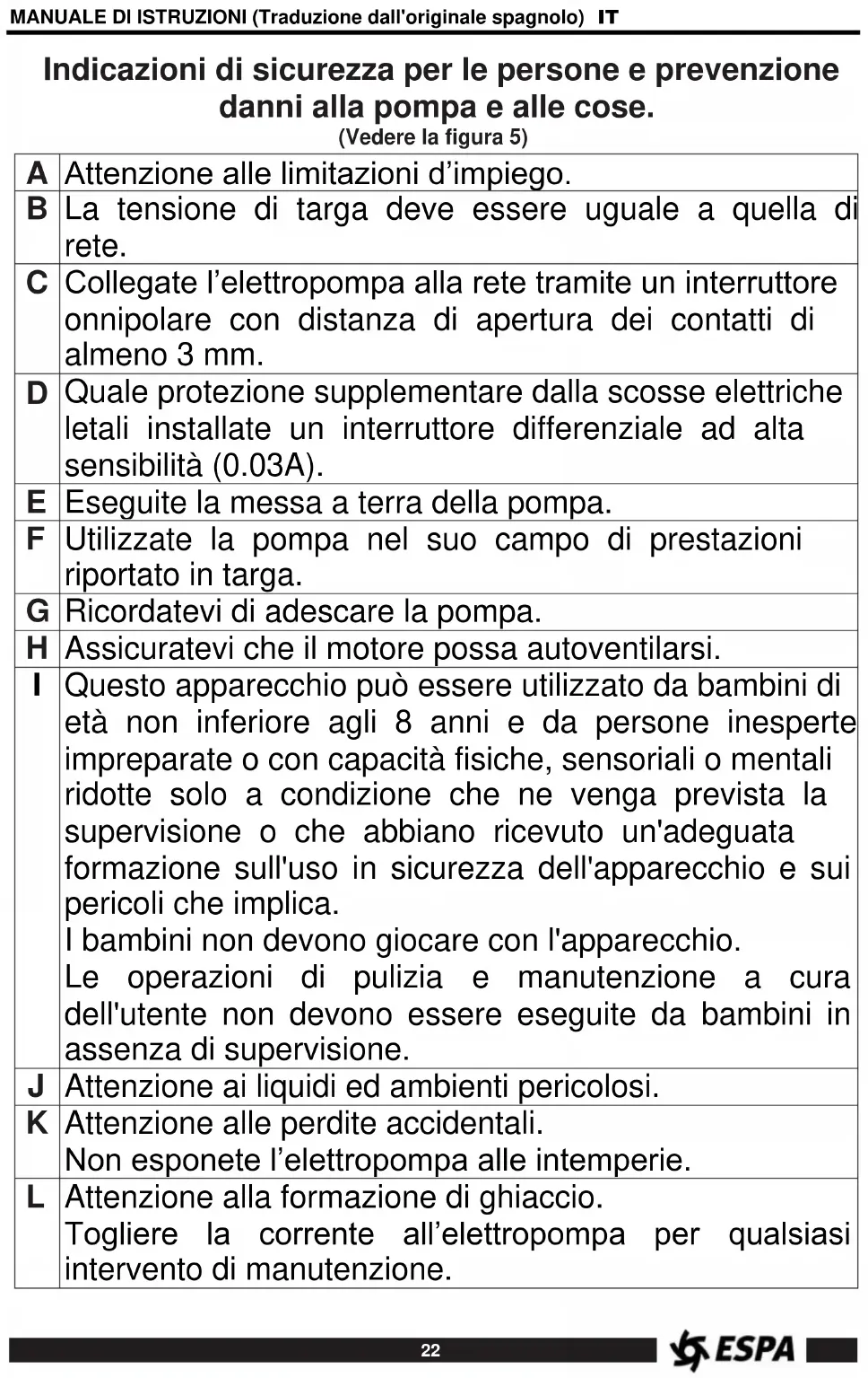 Le nostre pompe non hanno bisogno di nessuno manutenzione specifica o programmata. Pulire la pompa con un panno umido, senza usare prodotti aggressivi. Si raccomanda tuttavia di vuotare la tubatura durante os periodos de baixas temperaturas. Em caso de inactividade prolongada, si dovrà pulire la pompa e riporla in un luogo secco e ventilato. ATTENZIONE: In caso di avaria, la sostituzione del cabo elettrico e la manipolazione della pompa potranno essere eseguiti soltanto da un servizio di assistenza tecnica ufficiale. L'elenco dei servizi tecnici autorizzati è in www.espa.com.