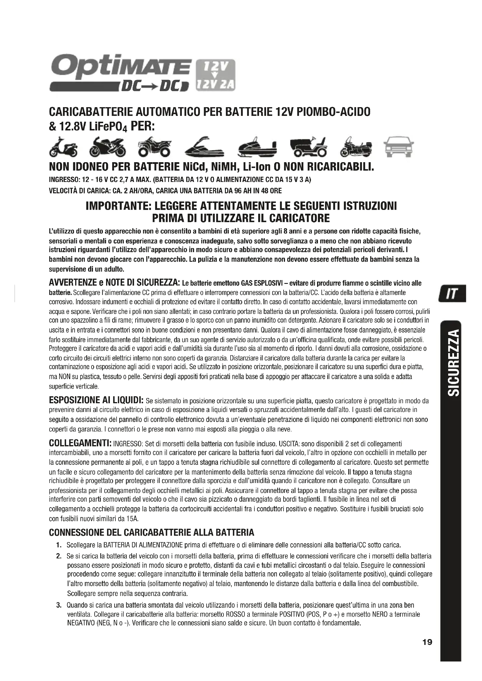 PER: NON IDONEO PER BATTERIE NiCd, NiMH, Li-Ion O NON RICARICABILI. INGRESSO: 12 - 16 V CC 2,7 A MAX. (BATTERIA DA 12 V O ALIMENTAZIONE CC DA 15 V 3 A)VELOCITÀ DI CARICA: CA. 2 AH/ORA, CARICA UNA BATTERIA DA 96 AH IN 48 OREIMPORTANTE: LEGGERE ATTENTAMENTE LE SEGUENTI ISTRUZIONI PRIMA DI UTILIZZARE IL CARICATORE L’utilizzo di questo apparecchio non è consentito a bambini di età superiore agli 8 anni e a persone con ridotte capacità fisiche, sensoriali o mentali o con esperienza e conoscenza inadeguate, salvo sotto sorveglianza o a meno che non abbiano ricevuto istruzioni riguardanti l’utilizzo dell’apparecchio in modo sicuro e abbiano consapevolezza dei potenziali pericoli derivanti. I bambini non devono giocare con l’apparecchio. La pulizia e la manutenzione non devono essere effettuate da bambini senza la supervisione di un adulto. AVVERTENZE e NOTE DI SICUREZZA: Le batterie emettono GAS ESPLOSIVI – evitare di produrre fiamme o scintille vicino alle batterie. Scollegare l’alimentazione CC prima di effettuare o interrompere connessioni con la batteria/CC. L’acido della batteria è altamente corrosivo. Indossare indumenti e occhiali di protezione ed evitare il contatto diretto. In caso di contatto accidentale, lavarsi immediatamente con acqua e sapone. Verificare che i poli non siano allentati; in caso contrario portare la batteria da un professionista. Qualora i poli fossero corrosi, pulirli con uno spazzolino a fili di rame; rimuovere il grasso e lo sporco con un panno inumidito con detergente. Azionare il caricatore solo se i conduttori in uscita e in entrata e i connettori sono in buone condizioni e non presentano danni. Qualora il cavo di alimentazione fosse danneggiato, è essenziale farlo sostituire immediatamente dal fabbricante, da un suo agente di servizio autorizzato o da un’officina qualificata, onde evitare possibili pericoli. Proteggere il caricatore da acidi e vapori acidi e dall’umidità sia durante l’uso sia al momento di riporlo. I danni dovuti alla corrosione, ossidazione o corto circuito dei circuiti elettrici interno non sono coperti da garanzia. Distanziare il caricatore dalla batteria durante la carica per evitare la contaminazione o esposizione agli acidi e vapori acidi. Se utilizzato in posizione orizzontale, posizionare il caricatore su una superfici dura e piatta, ma NON su plastica, tessuto o pelle. Servirsi degli appositi fori praticati nella base di appoggio per attaccare il caricatore a una solida e adatta superficie verticale. ESPOSIZIONE AI LIQUIDI: Se sistemato in posizione orizzontale su una superficie piatta, questo caricatore è progettato in modo da prevenire danni al circuito elettrico in caso di esposizione a liquidi versati o spruzzati accidentalmente dall’alto. I guasti del caricatore in seguito a ossidazione del pannello di controllo elettronico dovuta a un’eventuale penetrazione di liquido nei componenti elettronici non sono coperti da garanzia. I connettori o le prese non vanno mai esposti alla pioggia o alla neve. COLLEGAMENTI: INGRESSO: Set di morsetti della batteria con fusibile incluso. USCITA: sono disponibili 2 set di collegamenti intercambiabili, uno a morsetti fornito con il caricatore per caricare la batteria fuori dal veicolo, l’altro in opzione con occhielli in metallo per la connessione permanente ai poli, e un tappo a tenuta stagna richiudibile sul connettore di collegamento al caricatore. Questo set permette un facile e sicuro collegamento del caricatore per la mantenimento della batteria senza rimozione dal veicolo. Il tappo a tenuta stagna richiudibile è progettato per proteggere il connettore dalla sporcizia e dall’umidità quando il caricatore non è collegato. Consultare un professionista per il collegamento degli occhielli metallici ai poli. Assicurare il connettore al tappo a tenuta stagna per evitare che possa interferire con parti semoventi del veicolo o che il cavo sia pizzicato o danneggiato da bordi taglienti. Il fusibile in linea nel set di collegamento a occhielli protegge la batteria da cortocircuiti accidentali fra i conduttori positivo e negativo. Sostituire i fusibili bruciati solo con fusibili nuovi similari da 15A.CONNESSIONE DEL CARICABATTERIE ALLA BATTERIA 1. Scollegare la BATTERIA DI ALIMENTAZIONE prima di effettuare o di eliminare delle connessioni alla batteria/CC sotto carica. 2. Se si carica la batteria del veicolo con i morsetti della batteria, prima di effettuare le connessioni verificare che i morsetti della batteria possano essere posizionati in modo sicuro e protetto, distanti da cavi e tubi metallici circostanti o dal telaio. Eseguire le connessioni procedendo come segue: collegare innanzitutto il terminale della batteria non collegato al telaio (solitamente positivo), quindi collegare l’altro morsetto della batteria (solitamente negativo) al telaio, mantenendo le distanze dalla batteria e dalla linea del combustibile. Scollegare sempre nella sequenza contraria. 3. Quando si carica una batteria smontata dal veicolo utilizzando i morsetti della batteria, posizionare quest’ultima in una zona ben ventilata. Collegare il caricabatterie alla batteria: morsetto ROSSO a terminale POSITIVO (POS, P o +) e morsetto NERO a terminale NEGATIVO (NEG, N o -). Verificare che le connessioni siano salde e sicure. Un buon contatto è fondamentale.20 4. Se la batteria è molto scarica (e probabilmente solfatizzata), rimuoverla dal veicolo e ispezionarla prima di collegare il caricabatterie per effettuare un tentativo di recupero. Effettuare un’ispezione visiva della batteria per rilevare la presenza di eventuali difetti meccanici, quali una scatola curvata o incrinata, oppure segni di perdite di elettroliti. Se la batteria presenta tappi per riempimento e le placche nelle celle sono visibili dall’esterno, esaminare attentamente la batteria per cercare di stabilire se alcune celle hanno un aspetto diverso dalle altre (ad esempio, se presentano del materiale bianco tra le placche