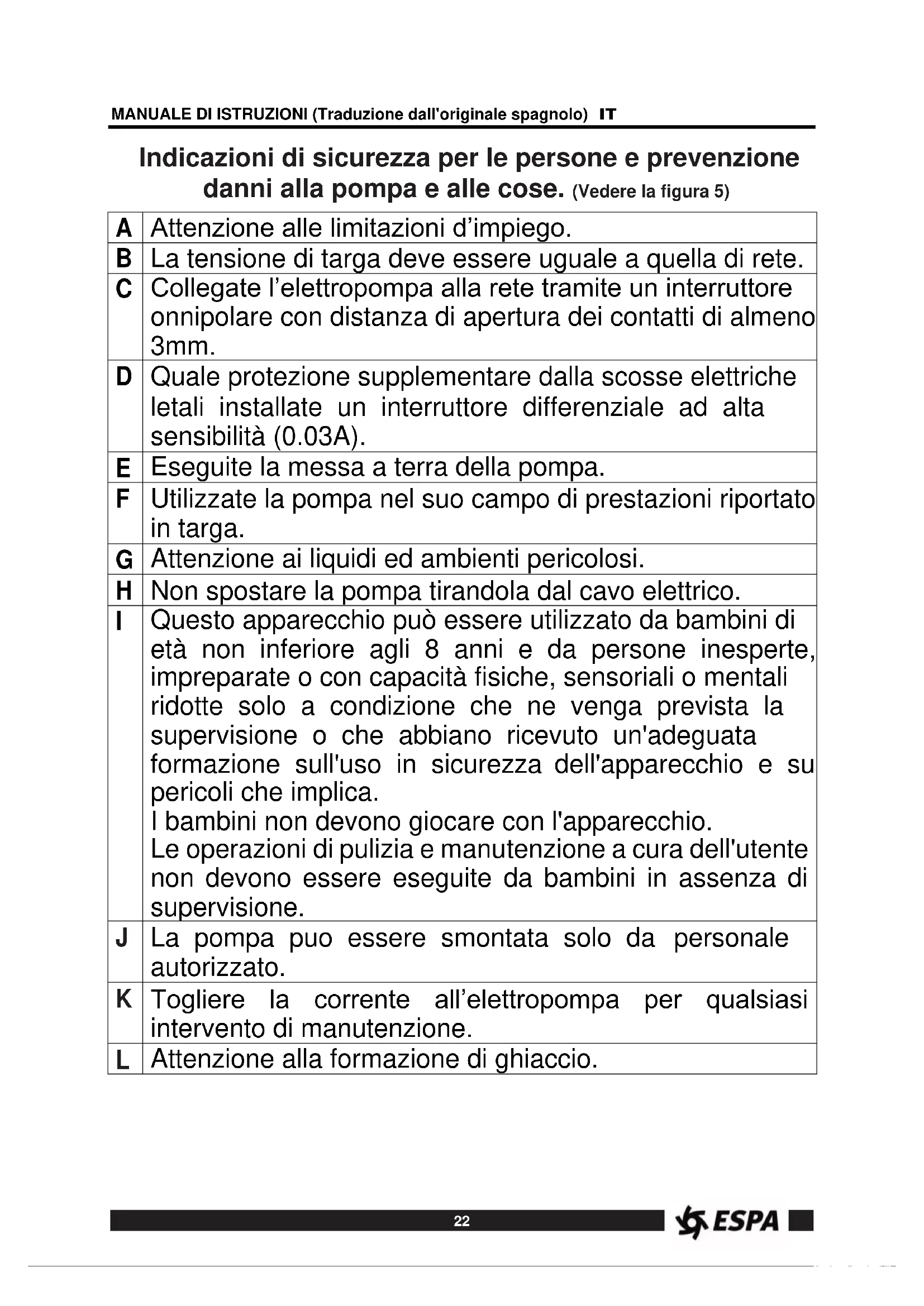 5.2. Montaggio della tubatura d‘impulsione Qualora il percorso della mandata fosse notevolmente lungo o con molte curve, si raccomanda l'uso di tubazioni di diametro maggiore a quello dell’apertura di mandata, per evitare al massimo le perdite di carico dovute all'attrito e ottenere il massimo rendimento idraulico possibile. Installare una valvola di ritegno all’uscita della pompa per evitare che la tubatura si vuoti ogni volta che la pompa si ferma. La valvola di ritenuta deve permettere il passaggio dei solidi. Evitare che il tubo si pieghi e provvedere a fissarlo bene nel collegamento d’uscita, dato che, oltre a non consentire la portata desiderata, ostacolerà il normale funzionamento della pompa. 5.3. Collegamento elettrico L’impanto elettrico dovrà essere dotato di una valida messa a terra ed essere conforme alla normativa nazionale vigente. La protezione del sistema si baserà su un interruttore differenziale (Δfn = 30mA) e di un sistema a separazione multipla, con apertura dei contatti di almeno 3mm. Le pompe con quadro di avviamento o condensatore incorporato vengono fornite pronte per l’uso. Nel caso delle bombe trifase, sarà l’utente a provvedere alla protezione. Tutte le pompe devono essere collegate ad un quadro di controllo che disponga di salvamotore. I quadri di controllo di ESPA hanno il salvamotore incorporato. Insieme al quadro vengono fornite le istruzioni di funzionamento e i dati tecnici. 5.4. Dispositivi di controllo L'installatore deve montare un sistema di rilevamento del livello di liquido che assicuri che la pompa lavori sempre sommersa. Le pompe vengono fornite con protezione termica negli avvolgimenti. Queste devono essere associate ad un relé di protezione per poter sconnettere la pompa prima che l'avvolgimento raggiunga la temperatura massima consentita. La normativa non ammette la riconnessione automatica, pertanto nel quadro di controllo si deve disporre anche di un sistema per evitare il riarmo automatico. I quadri della ESPA dispongono di tutti i dispositivi di sicurezza menzionati. Vedi schema dei collegamenti (Fig. 2). 5.5. Controlli previ alla essa in arcia iniziale Verificare che la tensione e la frequenza della rete corrispondano con quelle indicate sulla piastrina delle caratteristiche. Verificare che la pompa sia sommersa come indicato nella fig.3. LA POMPA NON DEVE MAI FUNZIONARE A SECCO.