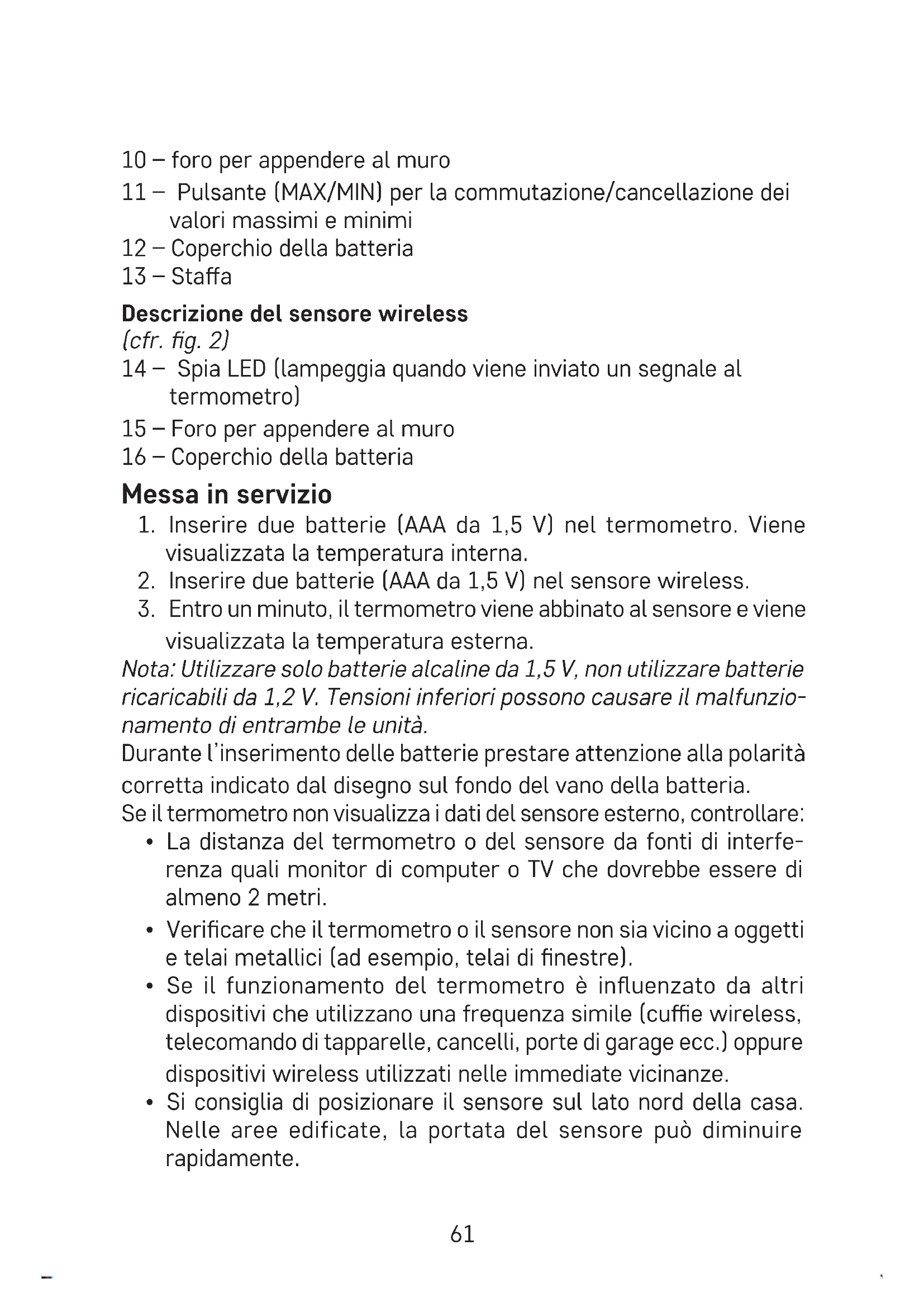 visualizzata la temperatura esterna. Nota: Utilizzare solo batterie alcaline da 1,5 V, non utilizzare batterie ricaricabili da 1,2 V. Tensioni inferiori possono causare il malfunzio- namento di entrambe le unità. Durante l’inserimento delle batterie prestare attenzione alla polarità corretta indicato dal disegno sul fondo del vano della batteria. Se il termometro non visualizza i dati del sensore esterno, controllare: