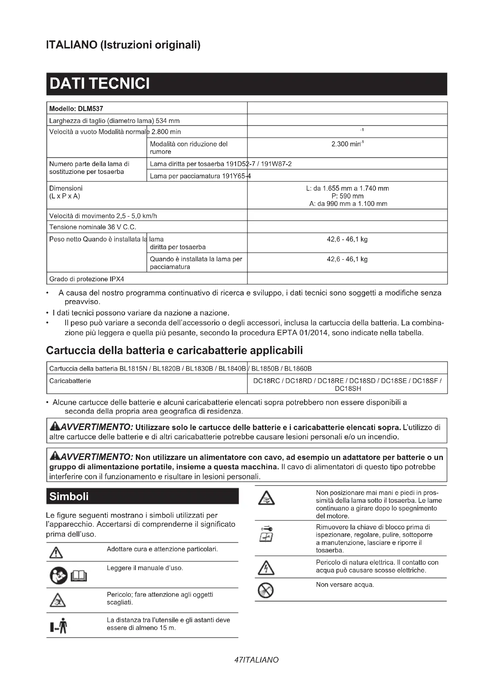 - Alcune cartucce delle batterie e alcuni caricabatterie elencati sopra potrebbero non essere disponibili a secondadellapropriaareageogracadiresidenza. AVVERTIMENTO: Utilizzare solo le cartucce delle batterie e i caricabatterie elencati sopra. L’utilizzo di altre cartucce delle batterie e di altri caricabatterie potrebbe causare lesioni personali e/o un incendio. AVVERTIMENTO: Non utilizzare un alimentatore con cavo, ad esempio un adattatore per batterie o un gruppo di alimentazione portatile, insieme a questa macchina. Il cavo di alimentatori di questo tipo potrebbe interferire con il funzionamento e risultare in lesioni personali. Simboli Legureseguentimostranoisimboliutilizzatiper l’apparecchio.Accertarsidicomprenderneilsignicato prima dell’uso. Adottare cura e attenzione particolari. Leggere il manuale d’uso. Pericolo; fare attenzione agli oggetti scagliati. La distanza tra l’utensile e gli astanti deve essere di almeno 15 m. Non posizionare mai mani e piedi in pros- simità della lama sotto il tosaerba. Le lame continuano a girare dopo lo spegnimento del motore. Rimuovere la chiave di blocco prima di ispezionare, regolare, pulire, sottoporre a manutenzione, lasciare e riporre il tosaerba. Pericolo di natura elettrica. Il contatto con acqua può causare scosse elettriche. Non versare acqua.48 ITALIANO Ni-MH Li-ionSolo per le nazioni dell’EUA causa della presenza di componenti pericolosinelleapparecchiature,iriutidiapparecchiature elettriche ed elettroniche, accumulatori e batterie potrebbero pro-durre un impatto negativo sull’ambiente e sulla salute umana.Non smaltire elettrodomestici elettrici ed elet-troniciobatterieinsiemeairiutidomestici!Inconformitàalladirettivaeuropeasuiriutidi apparecchiature elettriche ed elettroniche (RAEE), sugli accumulatori e le batterie, nonché suiriutidiaccumulatoriebatterie,ealsuoadattamentoallenormativenazionali,iriutidiapparecchiature elettriche ed elettroniche, bat-terie e accumulatori vanno conservati separata-mente e conferiti a un punto di raccolta separato peririuticomunali,operandoinconformitàallenormative per la protezione dell’ambiente.Tale requisito viene indicato mediante il simbolo del bidone della spazzatura con ruote barrato apposto sull’apparecchio.Livello di potenza sonora garantita in base alla Direttiva rumore macchine all’aperto UE. Livello di potenza sonora in base alla normativa sul controllo del rumore NSW australiana Utilizzo previsto La macchina è destinata alla tosatura di prati. Rumore Livello tipico di rumore pesato A determinato in base allo standard EN60335-2-77: NOTA: I valori sono stati misurati con la lama diritta per tosaerba o la lama per pacciamatura installate sul tosaerba. Livello di pressione sonora (L