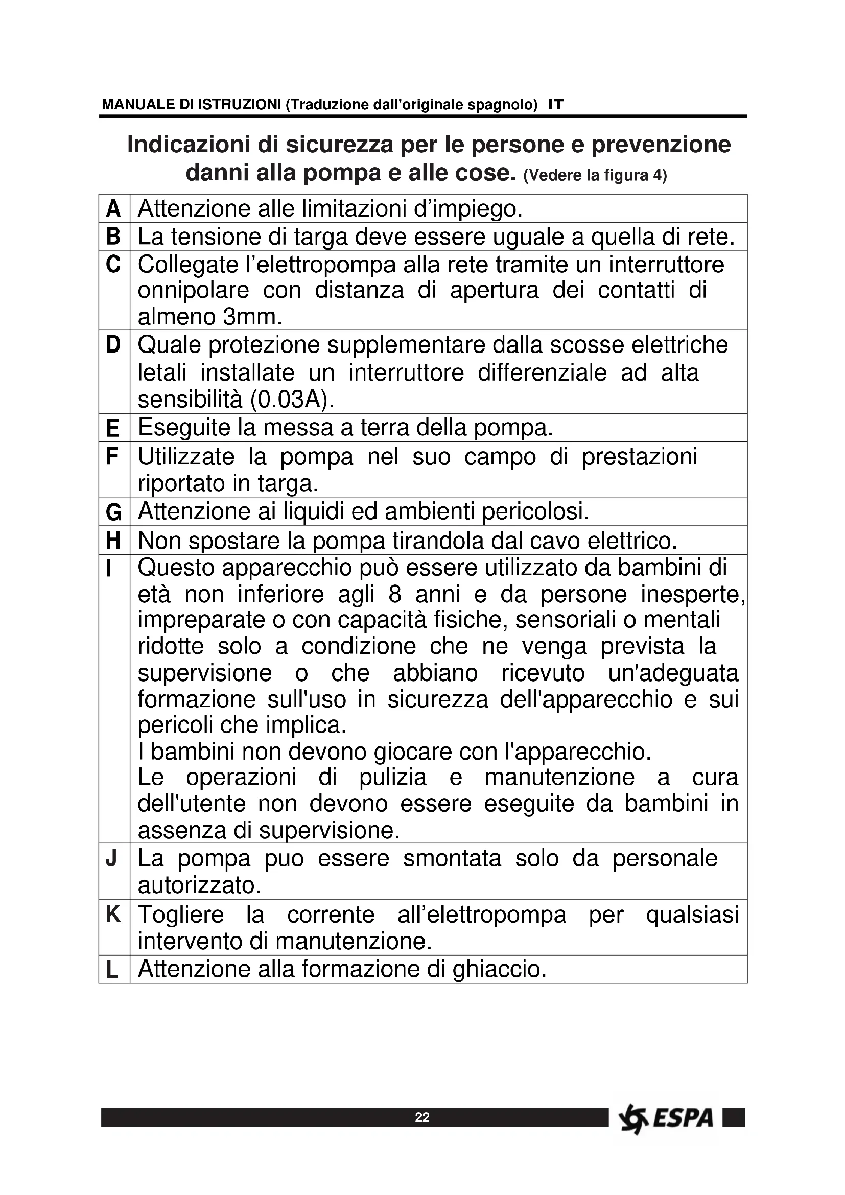In condizioni normali, le nostre pompe non hanno bisogno di nessuno manutenzione specifica o programmata. Si raccomanda tuttavia di vuotare la tubatura durante os periodos de baixas temperaturas. Em caso de inactividade prolongada, è raccomandabile tirarla fuori dal recipiente, pulirla e conservarla in un luogo secco e ventilato. ATTENZIONE: In caso di guasto, la sostituzione del cabo elettrico et la manipolazione de la pompa potranno essere eseguiti soltanto da un servizio di assistenza tecnica ufficiale. L'elenco dei servizi tecnici autorizzati è in www.espa.com.