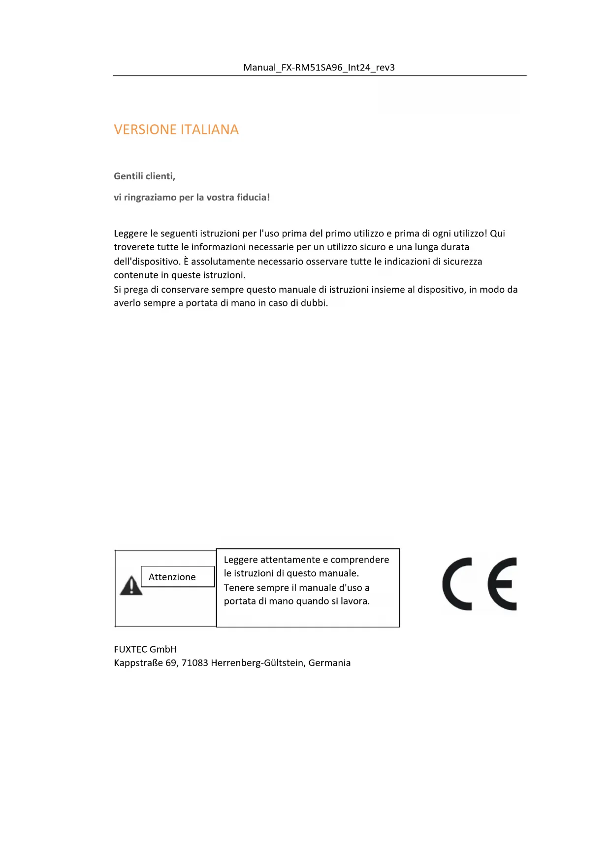 FUXTEC GmbH Kappstraße 69, 71083 Herrenberg-Gültstein, Germania Leggere attentamente e comprendere le istruzioni di questo manuale. Tenere sempre il manuale d'uso a portata di mano quando si lavora. AttenzioneManual_FX-RM51SA96_Int24_rev3