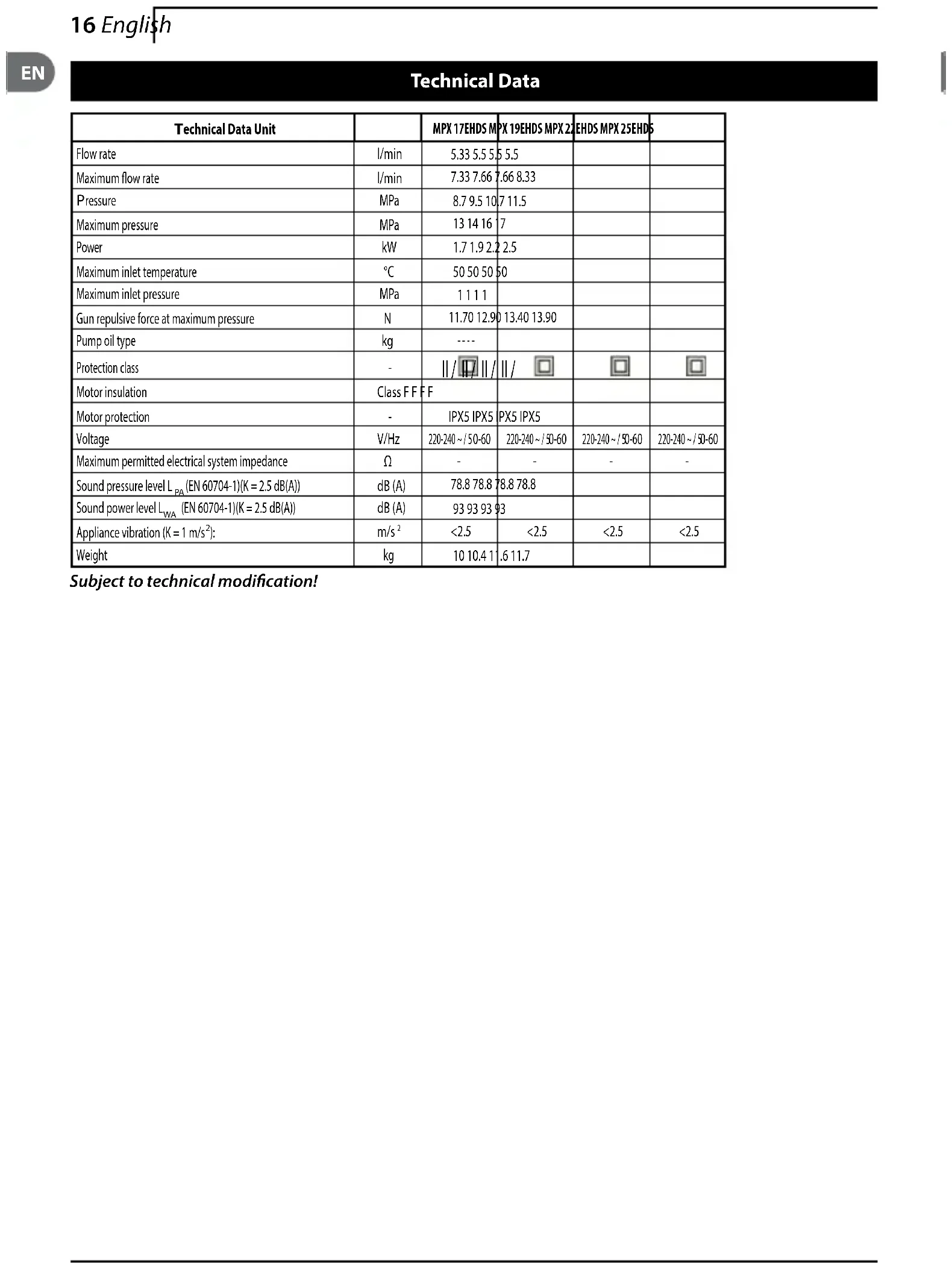 Pressione di alimentazione massima MPa 1 1 1 1Forza repulsiva della pistola alla pressione massima 11,70 12,90 13,40 13,90Tipo olio pompa - - - -Classe Protezione