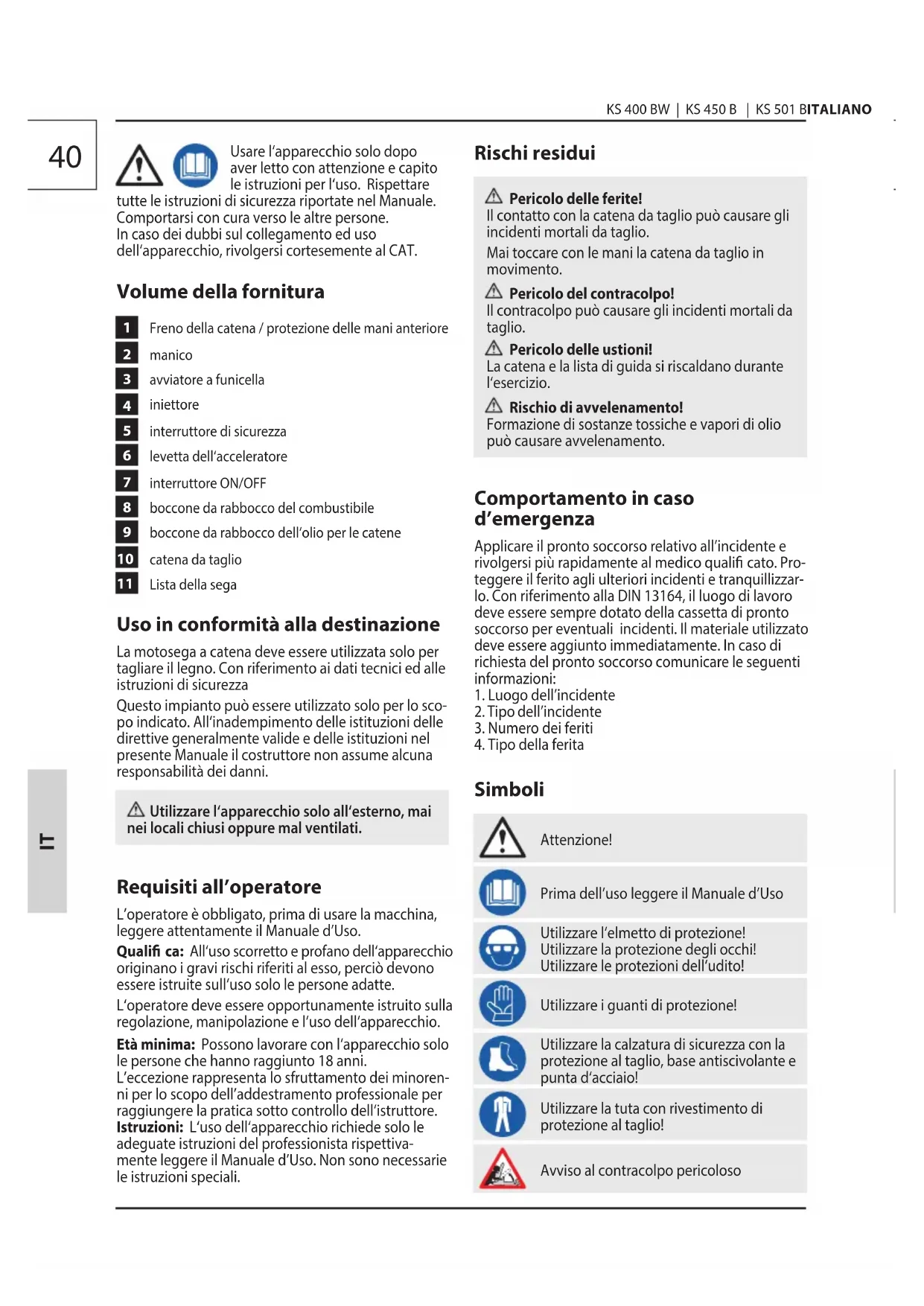 Simboli Attenzione! Prima dell’uso leggere il Manuale d’Uso Utilizzare l‘elmetto di protezione! Utilizzare la protezione degli occhi! Utilizzare le protezioni dell‘udito! Utilizzare i guanti di protezione! Utilizzare la calzatura di sicurezza con la protezione al taglio, base antiscivolante e punta d‘acciaio! Utilizzare la tuta con rivestimento di protezione al taglio! Avviso al contracolpo pericoloso41 KS 400 BW | KS 450 B | KS 501 B ITALIANO