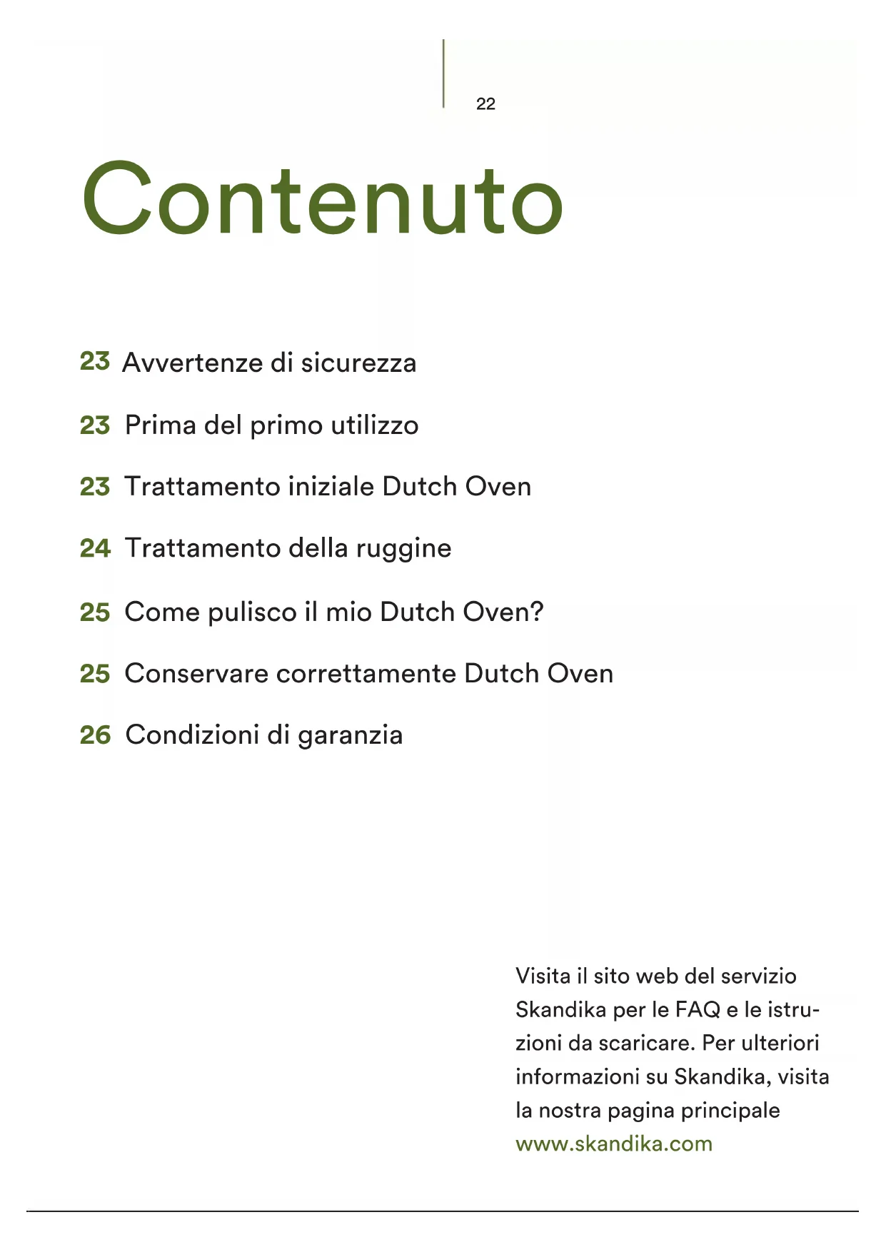 Avvertenze di sicurezza 23 Prima del primo utilizzo 23 Trattamento iniziale Dutch Oven 24 Trattamento della ruggine 25 Come pulisco il mio Dutch Oven? 25 Conservare correttamente Dutch Oven 26 Condizioni di garanzia Visita il sito web del servizio Skandika per le FAQ e le istru- zioni da scaricare. Per ulteriori informazioni su Skandika, visita la nostra pagina principale www.skandika.comIT