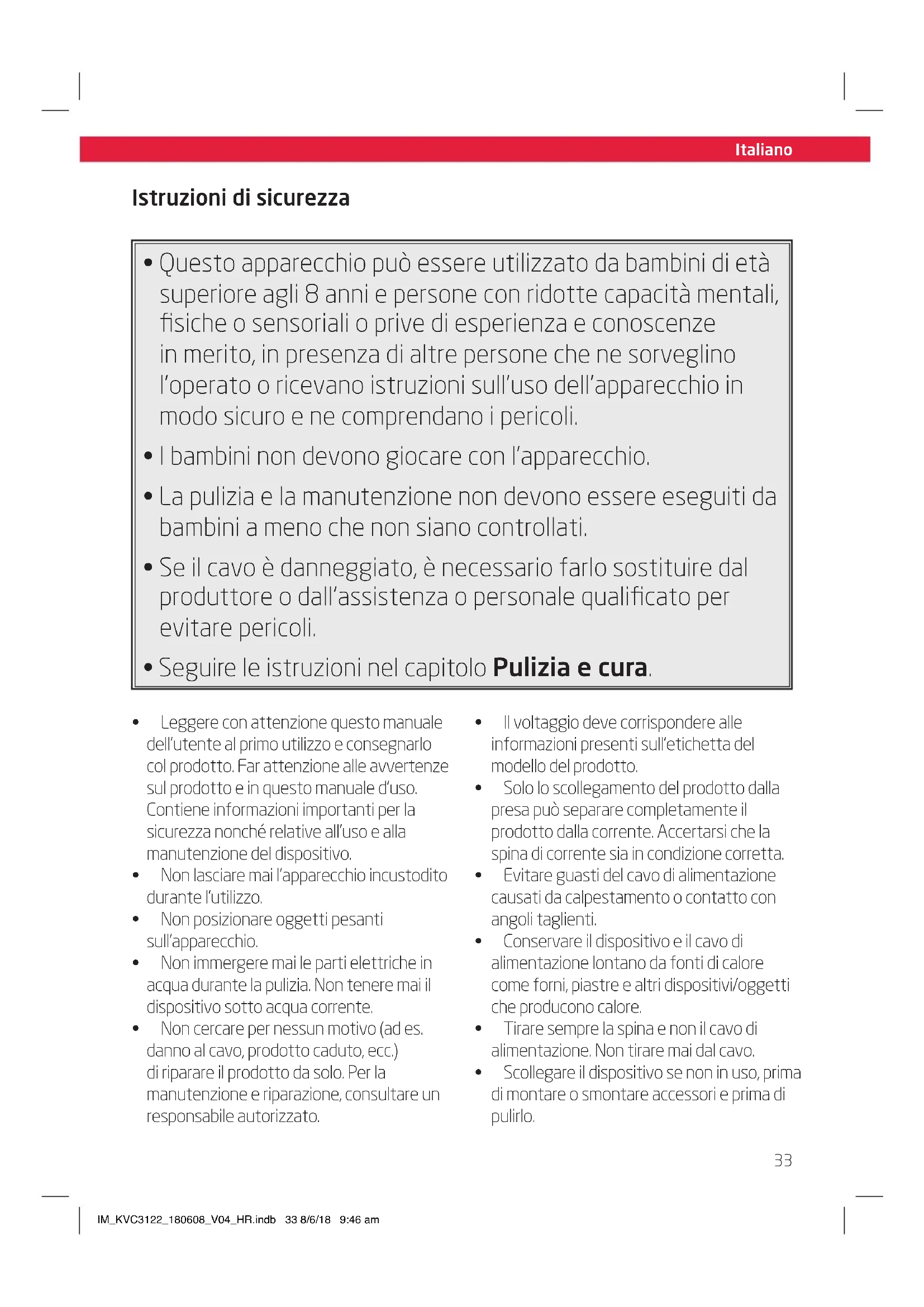 - Scollegare il dispositivo se non in uso, prima di montare o smontare accessori e prima di pulirlo. IM_KVC3122_180608_V04_HR.indb 33 8/6/18 9:46 amSize - A5 Italiano