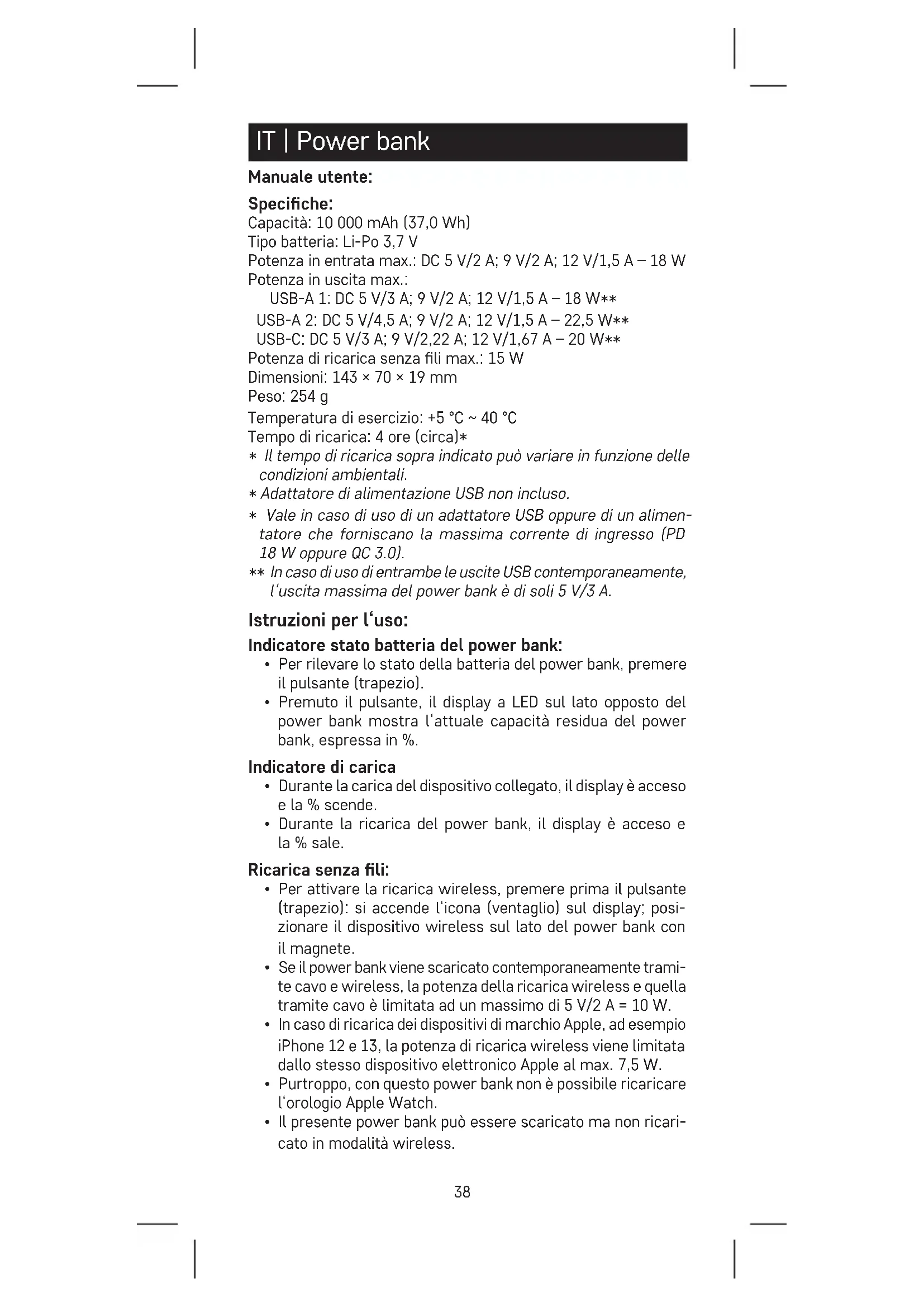 - Per prolungare la durata della batteria del power bank, mantenere il livello di carica della stessa possibilmente nel range di 25–75%. Dispositivi supportati: tablet, cellulari, macchine fotograche, videocamere, lettori MP3, navigatori GPS, casse portatili. La prima carica può richiedere più tempo. Prima dell‘utilizzo, leggere attentamente il manuale utente. È normale che durante la ricarica/scarica l‘involucro del power bank si riscaldi. Terminata l‘operazione, la temperatura scende alla temperatura ambiente. Se la carica non si avvia entro 3 secondi, scollegare e ricollegare il power bank. Terminata la ricarica, scollegare tutti i cavi; il power bank si spegne automaticamente. Sia per la ricarica che per l‘uso del power bank può essere usato il cavo fornito in dotazione (se incluso), oppure qualsiasi altro cavo USB di qualità. Per ridurre al minimo il tempo di ricarica del power bank, utilizzare un adattatore e un cavo USB previsti per una corrente uguale o superiore a quella di ingresso del power bank. La confezione di questo prodotto include un anello metallico, fornito con il prodotto per garantire una migliore compatibilità, velocità e stabilità della ricarica wireless. Prima di applicare l‘anello, vericare sempre il funzionamento corretto della ricarica. Su alcuni modelli dei cellulari la ricarica wireless con questo anello può non funzionare in modo ottimale. L‘anello in oggetto può essere applicato sia direttamente sul corpo del cellulare che sulla cover dello stesso. Prima dell‘applicazione dell‘anello, accostarlo alla base MagSafe del power bank. Dopo accostare il cellulare al power bank in modo che la ricarica av- venga correttamente. In tale modo si rileva in quale punto e con quale orientamento deve essere applicato l‘anello. Con l‘anello applicato sul dispositivo da caricare è garantita una connessione più salda con la base magnetica wireless del power bank. Inoltre, su alcuni modelli di cellulari si ottiene una maggiore stabilità e velocità di ricarica (in caso di ricarica wireless rapida, sul display del power bank si accende un‘icona fulmine verde). Su alcuni modelli di cellulari, la ricarica wireless tramite questo power bank risulta funzionante solo con l‘anello. Se la ricarica wireless non funziona, provarla con questo anello. La ricarica wireless è inuenzata anche dall‘uso di una cover pro- tettiva del cellulare. Quindi, se la ricarica wireless non funziona, provarla senza la cover.40 L‘anello menzionato può essere usato anche per lo smartphone Apple dotato di meccanismo MagSafe. Con questo power bank possono essere ricaricati – senza utilizzo dell‘anello metallico – alcuni modelli di auricolari Airpods. Questo dispositivo non è destinato all‘uso da parte di persone (compresi i bambini) le cui incapacità siche, sensoriali o mentali o la cui mancanza di esperienza o di conoscenze impediscano l‘u- so sicuro del dispositivo stesso, a meno che non siano sorvegliate o istruite sull‘uso del dispositivo da una persona responsabile della loro sicurezza. Proteggere il prodotto dall‘umidità, acqua e altri liquidi, dal calore e da fonti di forte radiazione. Non smontare, cortocircuitare o piegare il prodotto e proteggerlo da oggetti pesanti o urti improvvisi. Non smaltire con i riuti domestici. Utilizza punti di rac- colta speciali per i riuti dierenziati. Contatta le autorit à locali per informazioni sui punti di raccolta. Se i dispositi- vi elettronici dovessero essere smaltiti in discarica, le sostanze pericolose potrebbero raggiungere le acque sotterranee e, di conseguenza, la catena alimentare, dove potrebbe inuire sulla salute umana. ES | Power bank Manual del usuario: Especicación: Capacidad: 10 000 mAh (37,0 Wh) Tipo de batería: Li-Po 3,7 V Potencia de entrada máxima: DC 5 V/2 A; 9 V/2 A; 12 V/1,5 A – 18 W Potencia de salida máxima: USB-A 1: DC 5 V/3 A; 9 V/2 A; 12 V/1,5 A – 18 W** USB-A 2: DC 5 V/4,5 A; 9 V/2 A; 12 V/1,5 A – 22,5 W** USB-C: DC 5 V/3 A; 9 V/2,22 A; 12 V/1,67 A – 20 W** Potencia máxima de carga inalámbrica: 15 W Medidas: 143 × 70 × 19 mm Peso: 254 g Temperatura de funcionamiento: +5 °C ~ 40 °C Tiempo de carga: 4 horas (aproximadamente)*