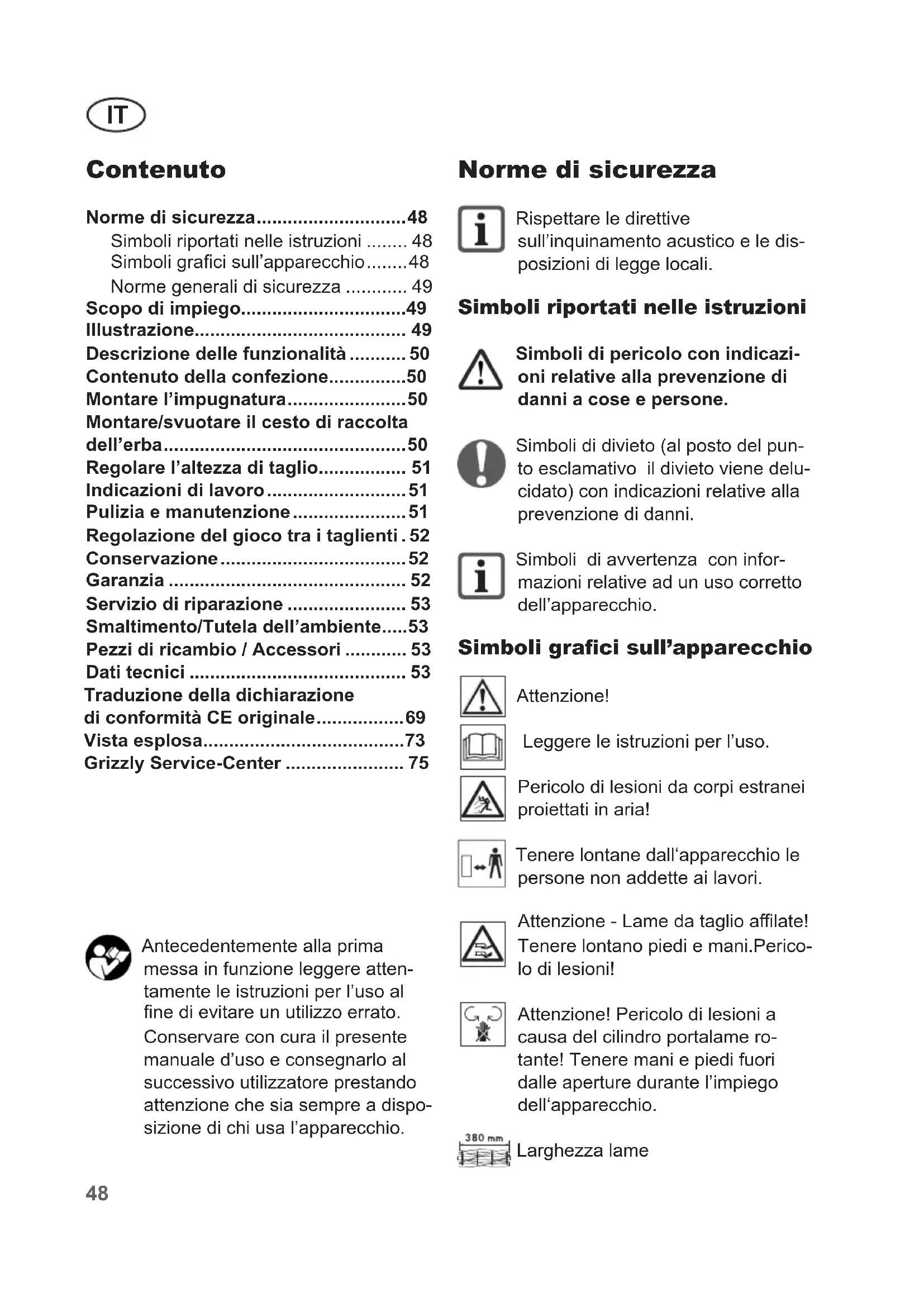 - Norme di sicurezza Rispettare le direttive sull’inquinamento acustico e le dis- posizioni di legge locali. Simboli riportati nelle istruzioni Simboli di pericolo con indicazi- oni relative alla prevenzione di danni a cose e persone. Simboli di divieto (al posto del pun- to esclamativo il divieto viene delu- cidato) con indicazioni relative alla prevenzione di danni. Simboli di avvertenza con infor- mazioni relative ad un uso corretto dell’apparecchio. Simboli graci sull’apparecchio Attenzione! Leggere le istruzioni per l’uso. Pericolo di lesioni da corpi estranei proiettati in aria! Tenere lontane dall‘apparecchio le persone non addette ai lavori. Attenzione - Lame da taglio alate! Tenere lontano piedi e mani.Perico- lo di lesioni! Attenzione! Pericolo di lesioni a causa del cilindro portalame ro- tante! Tenere mani e piedi fuori dalle aperture durante l’impiego dell‘apparecchio. Larghezza lame Antecedentemente alla prima messa in funzione leggere atten- tamente le istruzioni per l’uso al ne di evitare un utilizzo errato. Conservare con cura il presente manuale d’uso e consegnarlo al successivo utilizzatore prestando attenzione che sia sempre a dispo- sizione di chi usa l’apparecchio. Contenuto Norme di sicurezza p. 48