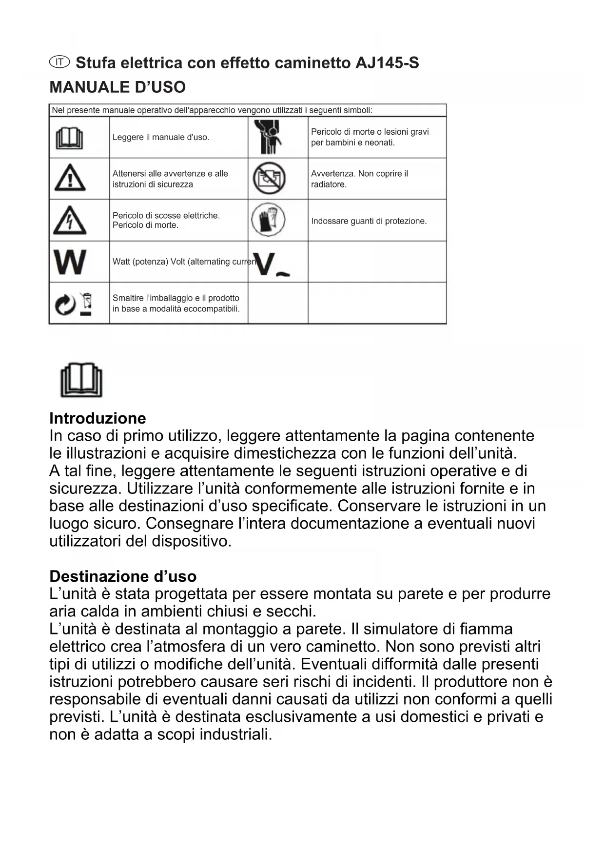 Nel presente manuale operativo dell'apparecchio vengono utilizzati i seguenti simboli: Leggere il manuale d'uso. Pericolo di morte o lesioni gravi per bambini e neonati. Attenersi alle avvertenze e alle istruzioni di sicurezza Avvertenza. Non coprire il radiatore. Pericolo di scosse elettriche. Pericolo di morte. Indossare guanti di protezione. Watt (potenza) Volt (alternating current) Smaltire l’imballaggio e il prodotto in base a modalità ecocompatibili. Introduzione In caso di primo utilizzo, leggere attentamente la pagina contenente le illustrazioni e acquisire dimestichezza con le funzioni dell’unità. A tal ne, leggere attentamente le seguenti istruzioni operative e di sicurezza. Utilizzare l’unità conformemente alle istruzioni fornite e in base alle destinazioni d’uso specicate. Conservare le istruzioni in un luogo sicuro. Consegnare l’intera documentazione a eventuali nuovi utilizzatori del dispositivo. Destinazione d’uso L’unità è stata progettata per essere montata su parete e per produrre aria calda in ambienti chiusi e secchi. L’unità è destinata al montaggio a parete. Il simulatore di amma elettrico crea l’atmosfera di un vero caminetto. Non sono previsti altri tipi di utilizzi o modiche dell’unità. Eventuali difformità dalle presenti istruzioni potrebbero causare seri rischi di incidenti. Il produttore non è responsabile di eventuali danni causati da utilizzi non conformi a quelli previsti. L’unità è destinata esclusivamente a usi domestici e privati e non è adatta a scopi industriali.Speciche tecniche Tensione nominale: 220-240 V Potenza nominale: 1800-2000W Illuminazione: LED da 9 W Dimensioni: 94 cm x 12 cm x 48 cm (l x p x a) Peso: circa 12 kg Ambito della fornitura Subito dopo aver rimosso l’imballaggio, controllare che la fornitura sia completa e che tutti i componenti del prodotto siano in buone condizioni. 1 caminetto elettrico da parete 1 telecomando 3 viti 3 tasselli 1 staffa di sicurezza 1 manuale delle istruzioni Pietre decorative Introduzione/Istruzioni di sicurezza Descrizione dei componenti