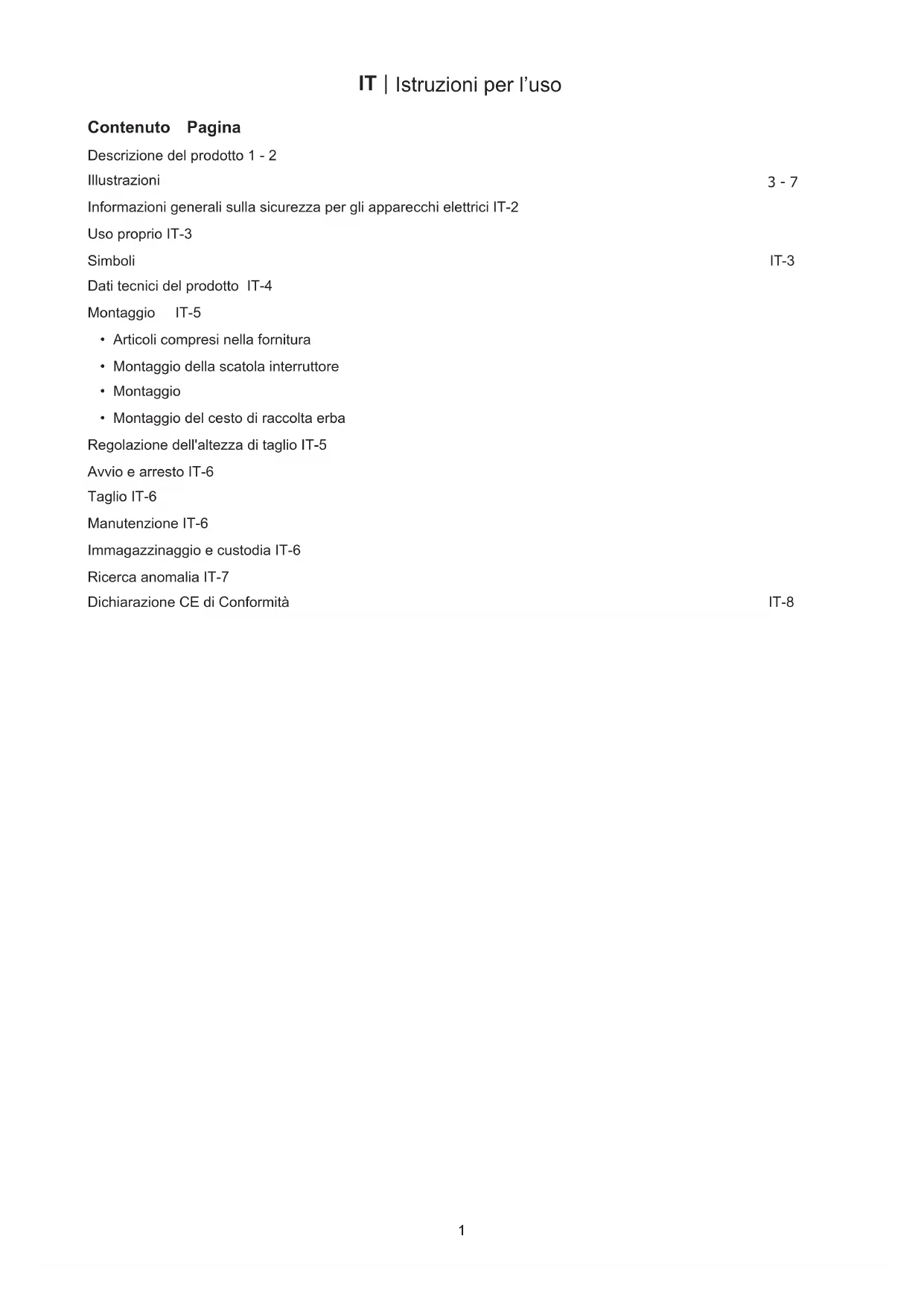 - Montaggio del cesto di raccolta erba Regolazione dell'altezza di taglio IT-5 Avvio e arresto IT-6 Taglio IT-6 Manutenzione IT-6 Immagazzinaggio e custodia IT-6 Ricerca anomalia IT-7 Dichiarazione CE di Conformità IT-82