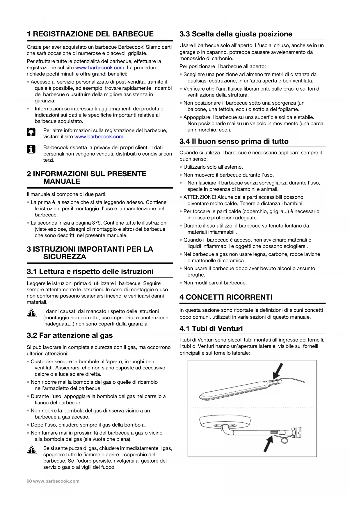 I tubi di Venturi sono piccoli tubi montati all’ingresso dei fornelli. I tubi di Venturi hanno un’apertura laterale, visibile sui fornelli principali e sul fornello laterale: MAN_GAS_QUISSON_BBC_140730_A.book Page 90 Tuesday, February 2, 2016 4:55 PMwww.barbecook.com 91 Durante il suo percorso verso i fornelli, il gas passa attraverso i tubi di Venturi. Per effetto delle aperture laterali, il gas si miscela con l’aria e - di conseguenza - con l’ossigeno. Questo è quanto occorre per la buona accensione dei fornelli: solo una miscela corretta di gas e ossigeno brucia appropriatamente e produrrà un bel fuoco.