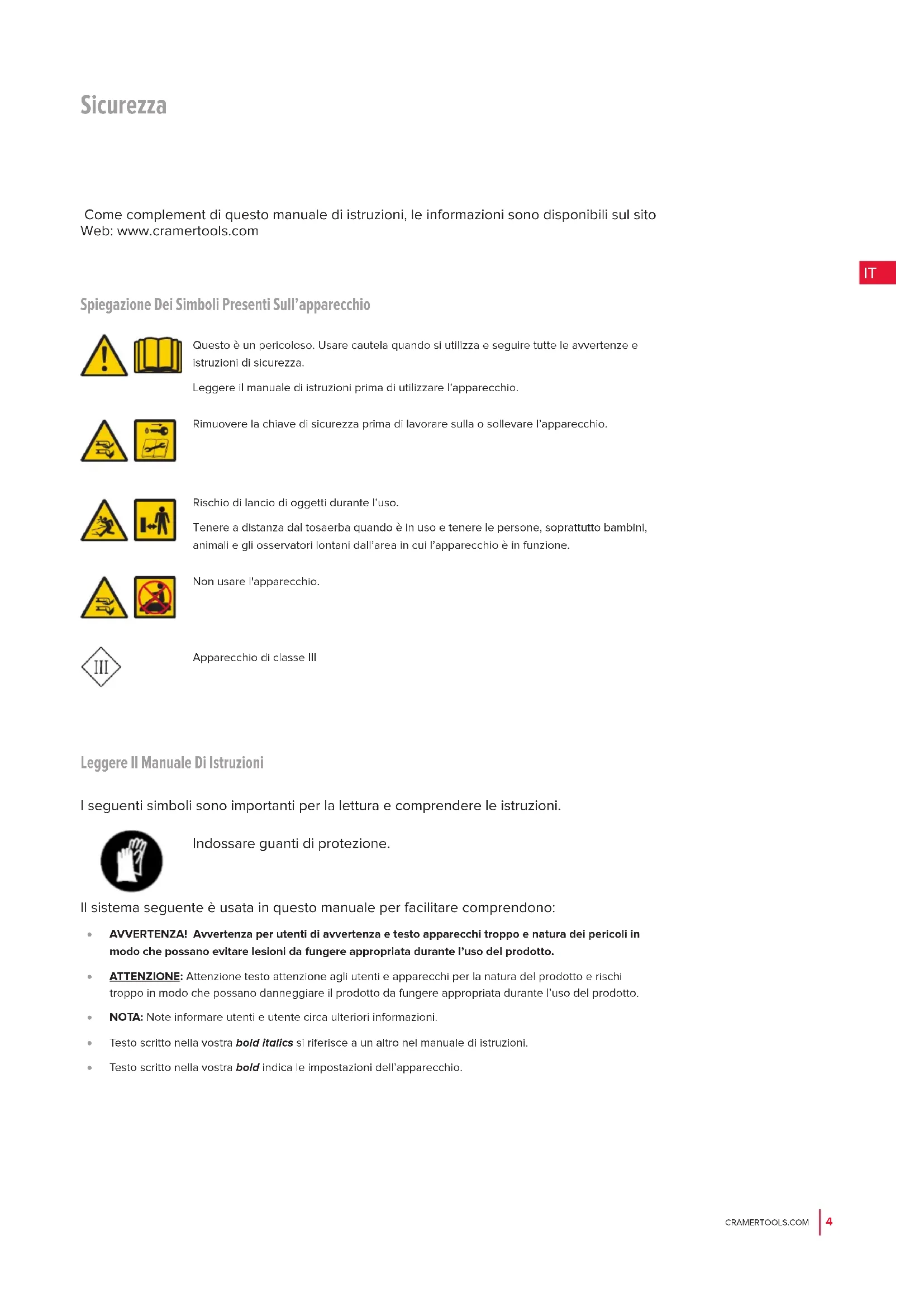 Spiegazione Dei Simboli Presenti Sull’apparecchio Questo è un pericoloso. Usare cautela quando si utilizza e seguire tutte le avvertenze e istruzioni di sicurezza. Leggere il manuale di istruzioni prima di utilizzare l’apparecchio. Rimuovere la chiave di sicurezza prima di lavorare sulla o sollevare l’apparecchio. Rischio di lancio di oggetti durante l’uso. Tenere a distanza dal tosaerba quando è in uso e tenere le persone, soprattutto bambini, animali e gli osservatori lontani dall’area in cui l’apparecchio è in funzione. Non usare l'apparecchio. Apparecchio di classe III Come complement di questo manuale di istruzioni, le informazioni sono disponibili sul sito Web: www.cramertools.com Leggere Il Manuale Di Istruzioni I seguenti simboli sono importanti per la lettura e comprendere le istruzioni. Indossare guanti di protezione. Il sistema seguente è usata in questo manuale per facilitare comprendono: