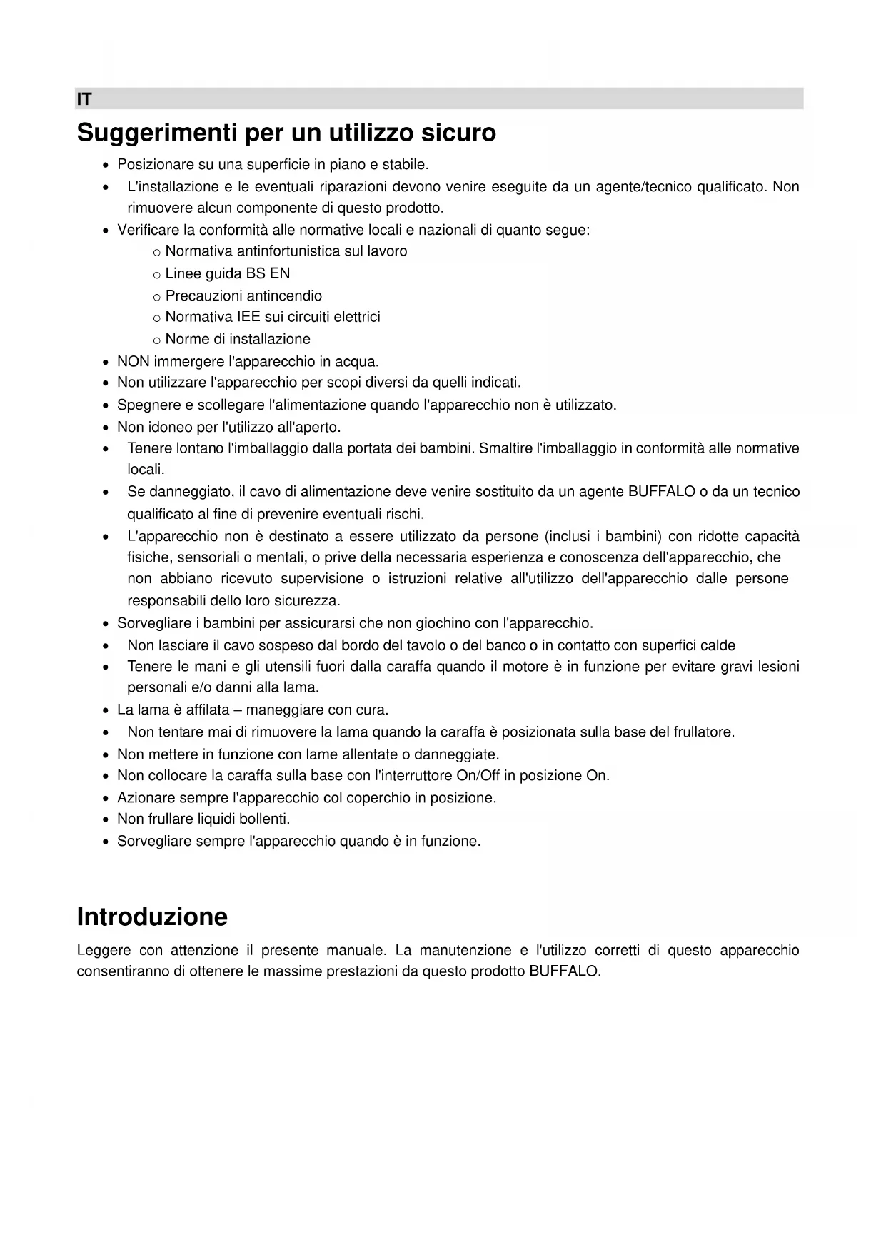 Alle Rechte vorbehalten. Diese Anleitung darf ohne vorherige schriftliche Erlaubnis von BUFFALO weder ganz noch auszugsweise in irgendeiner Form und auf irgendeinem Wege – ob elektronisch, mechanisch, durch Fotokopieren oder anderweitig – vervielfältigt oder übertragen werden. Es werden alle Anstrengungen unternommen um sicherzustellen, dass alle Angaben bei Drucklegung korrekt sind. BUFFALO behält sich jedoch das Recht vor, Spezifikationen ohne Vorankündigung zu ändern.IT Suggerimenti per un utilizzo sicuro Posizionare su una superficie in piano e stabile. L'installazione e le eventuali riparazioni devono venire eseguite da un agente/tecnico qualificato. Non rimuovere alcun componente di questo prodotto. Verificare la conformità alle normative locali e nazionali di quanto segue: o Normativa antinfortunistica sul lavoro o Linee guida BS EN o Precauzioni antincendio o Normativa IEE sui circuiti elettrici o Norme di installazione NON immergere l'apparecchio in acqua. Non utilizzare l'apparecchio per scopi diversi da quelli indicati. Spegnere e scollegare l'alimentazione quando l'apparecchio non è utilizzato. Non idoneo per l'utilizzo all'aperto. Tenere lontano l'imballaggio dalla portata dei bambini. Smaltire l'imballaggio in conformità alle normative locali. Se danneggiato, il cavo di alimentazione deve venire sostituito da un agente BUFFALO o da un tecnico qualificato al fine di prevenire eventuali rischi. L'apparecchio non è destinato a essere utilizzato da persone (inclusi i bambini) con ridotte capacità fisiche, sensoriali o mentali, o prive della necessaria esperienza e conoscenza dell'apparecchio, che non abbiano ricevuto supervisione o istruzioni relative all'utilizzo dell'apparecchio dalle persone responsabili dello loro sicurezza. Sorvegliare i bambini per assicurarsi che non giochino con l'apparecchio. Non lasciare il cavo sospeso dal bordo del tavolo o del banco o in contatto con superfici calde Tenere le mani e gli utensili fuori dalla caraffa quando il motore è in funzione per evitare gravi lesioni personali e/o danni alla lama. La lama è affilata – maneggiare con cura. Non tentare mai di rimuovere la lama quando la caraffa è posizionata sulla base del frullatore. Non mettere in funzione con lame allentate o danneggiate. Non collocare la caraffa sulla base con l'interruttore On/Off in posizione On. Azionare sempre l'apparecchio col coperchio in posizione. Non frullare liquidi bollenti. Sorvegliare sempre l'apparecchio quando è in funzione. Introduzione Leggere con attenzione il presente manuale. La manutenzione e l'utilizzo corretti di questo apparecchio consentiranno di ottenere le massime prestazioni da questo prodotto BUFFALO.IT Contenuto della confezione La confezione contiene: Frullatore BUFFALO Caraffa e coperchio del frullatore Pestello di sicurezza BUFFALO garantisce una qualità e un servizio impeccabili e assicura che al momento dell'imballaggio tutti i componenti forniti sono integralmente funzionanti e privi di difetti. Nel caso siano rilevati danni risultanti dal trasporto del prodotto, rivolgersi immediatamente al rivenditore BUFFALO locale. Posizione dei comandi