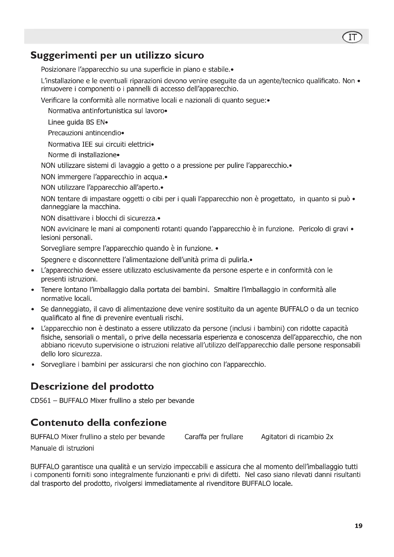 Suggerimenti per un utilizzo sicuro Posizionare l’apparecchio su una supercie in piano e stabile.• L’installazione e le eventuali riparazioni devono venire eseguite da un agente/tecnico qualicato. Non • rimuovere i componenti o i pannelli di accesso dell’apparecchio. Vericare la conformità alle normative locali e nazionali di quanto segue:• Normativa antinfortunistica sul lavoro• Linee guida BS EN• Precauzioni antincendio• Normativa IEE sui circuiti elettrici• Norme di installazione• NON utilizzare sistemi di lavaggio a getto o a pressione per pulire l’apparecchio.• NON immergere l’apparecchio in acqua.• NON utilizzare l’apparecchio all’aperto.• NON tentare di impastare oggetti o cibi per i quali l’apparecchio non è progettato, in quanto si può • danneggiare la macchina. NON disattivare i blocchi di sicurezza.• NON avvicinare le mani ai componenti rotanti quando l’apparecchio è in funzione. Pericolo di gravi • lesioni personali. Sorvegliare sempre l’apparecchio quando è in funzione. • Spegnere e disconnettere l’alimentazione dell’unità prima di pulirla.• L’apparecchio deve essere utilizzato esclusivamente da persone esperte e in conformità con le • presenti istruzioni. Tenere lontano l’imballaggio dalla portata dei bambini. Smaltire l’imballaggio in conformità alle • normative locali. Se danneggiato, il cavo di alimentazione deve venire sostituito da un agente BUFFALO o da un tecnico • qualicato al ne di prevenire eventuali rischi. L’apparecchio non è destinato a essere utilizzato da persone (inclusi i bambini) con ridotte capacità • siche, sensoriali o mentali, o prive della necessaria esperienza e conoscenza dell’apparecchio, che non abbiano ricevuto supervisione o istruzioni relative all’utilizzo dell’apparecchio dalle persone responsabili dello loro sicurezza. Sorvegliare i bambini per assicurarsi che non giochino con l’apparecchio.• Descrizione del prodotto CD561 – BUFFALO Mixer frullino a stelo per bevande Contenuto della confezione BUFFALO Mixer frullino a stelo per bevande Caraffa per frullare Agitatori di ricambio 2x Manuale di istruzioni BUFFALO garantisce una qualità e un servizio impeccabili e assicura che al momento dell’imballaggio tutti i componenti forniti sono integralmente funzionanti e privi di difetti. Nel caso siano rilevati danni risultanti dal trasporto del prodotto, rivolgersi immediatamente al rivenditore BUFFALO locale.IT