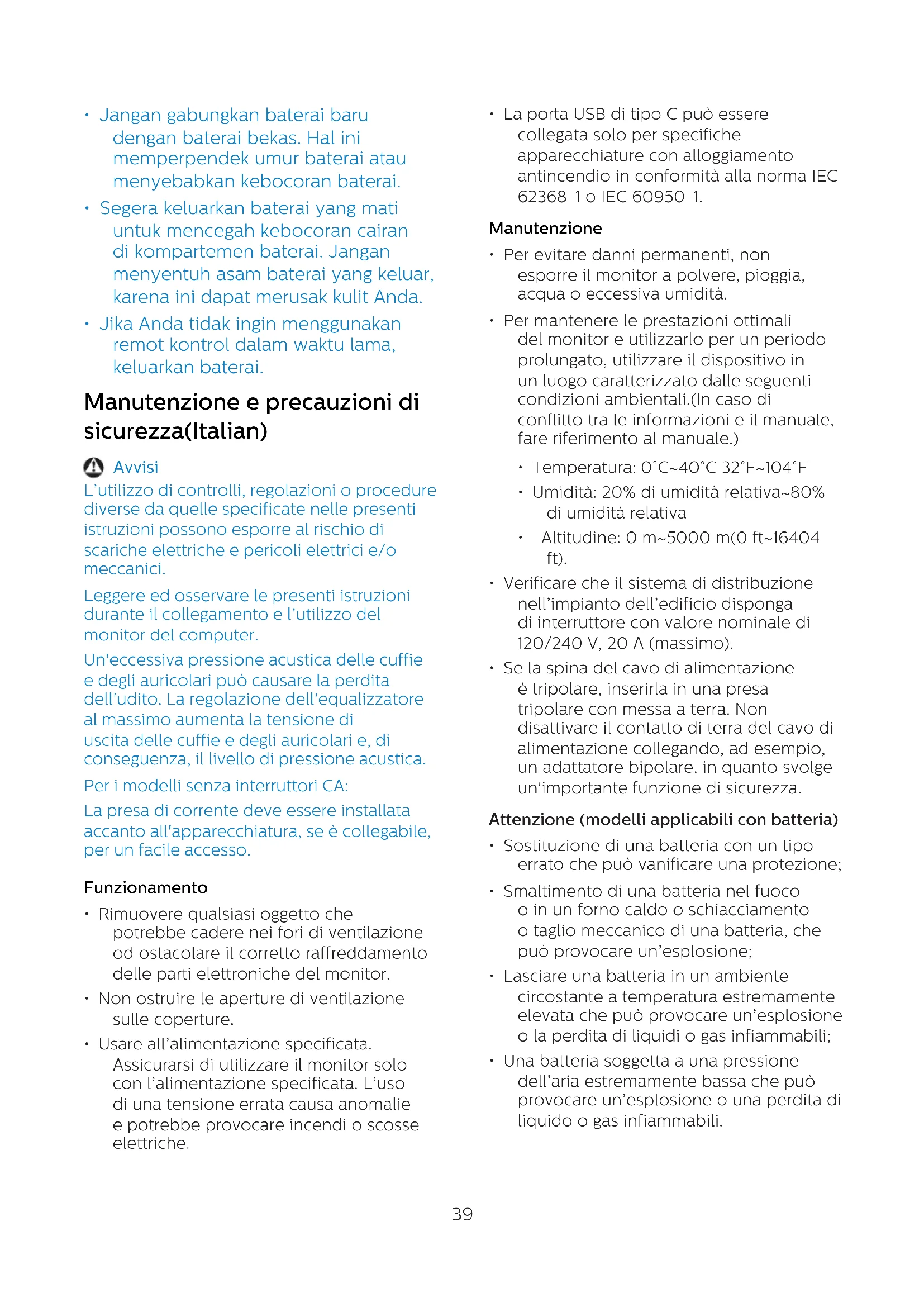 - Jika Anda tidak ingin menggunakan remot kontrol dalam waktu lama, keluarkan baterai. Manutenzione e precauzioni di sicurezza(Italian) Avvisi L’utilizzo di controlli, regolazioni o procedure diverse da quelle specificate nelle presenti istruzioni possono esporre al rischio di scariche elettriche e pericoli elettrici e/o meccanici. Leggere ed osservare le presenti istruzioni durante il collegamento e l’utilizzo del monitor del computer. Un'eccessiva pressione acustica delle cuffie e degli auricolari può causare la perdita dell'udito. La regolazione dell'equalizzatore al massimo aumenta la tensione di uscita delle cuffie e degli auricolari e, di conseguenza, il livello di pressione acustica. Per i modelli senza interruttori CA: La presa di corrente deve essere installata accanto all'apparecchiatura, se è collegabile, per un facile accesso. Funzionamento