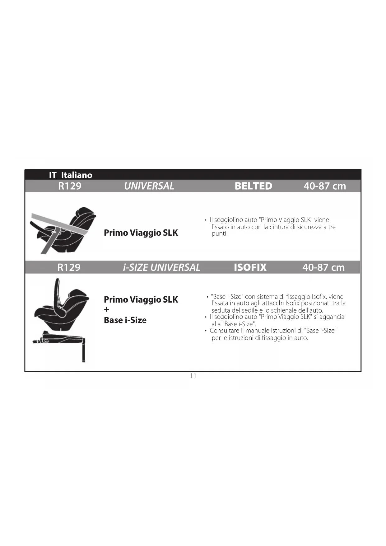 - Consultare il manuale istruzioni di "Base i-Size" per le istruzioni di fissaggio in auto. Primo Viaggio SLK