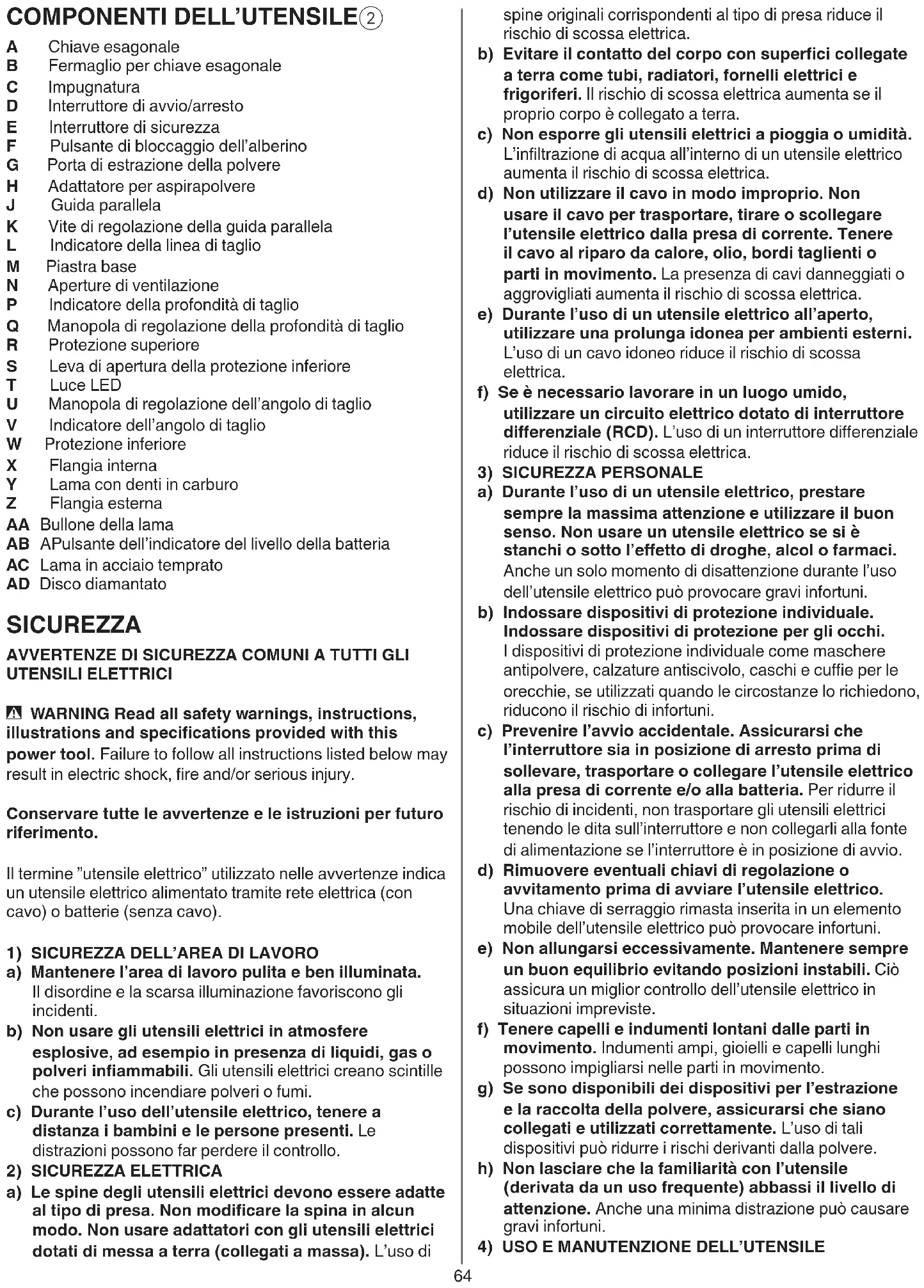 P Indicatore della profondità di taglio Q Manopola di regolazione della profondità di taglio R Protezione superiore S Leva di apertura della protezione inferiore T Luce LED U Manopola di regolazione dell’angolo di taglio V Indicatore dell’angolo di taglio W Protezione inferiore X Flangia interna Y Lama con denti in carburo Z Flangia esterna AA Bullone della lama AB APulsante dell’indicatore del livello della batteria AC Lama in acciaio temprato AD Disco diamantato SICUREZZA AVVERTENZE DI SICUREZZA COMUNI A TUTTI GLI UTENSILI ELETTRICI - WARNING Read all safety warnings, instructions, illustrationsandspecicationsprovidedwiththis power tool. Failure to follow all instructions listed below may result in electric shock, re and/or serious injury. Conservare tutte le avvertenze e le istruzioni per futuro riferimento. Il termine ”utensile elettrico” utilizzato nelle avvertenze indica un utensile elettrico alimentato tramite rete elettrica (con cavo) o batterie (senza cavo).