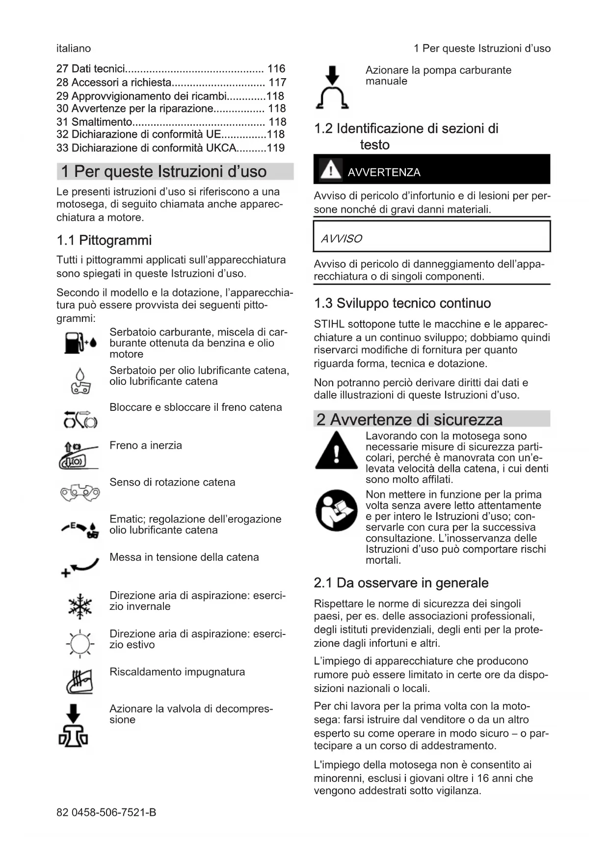 STIHL sottopone tutte le macchine e le apparec‐ chiature a un continuo sviluppo; dobbiamo quindi riservarci modifiche di fornitura per quanto riguarda forma, tecnica e dotazione. Non potranno perciò derivare diritti dai dati e dalle illustrazioni di queste Istruzioni d’uso. 2 Avvertenze di sicurezza Lavorando con la motosega sono necessarie misure di sicurezza parti‐ colari, perché è manovrata con un’e‐ levata velocità della catena, i cui denti sono molto affilati. Non mettere in funzione per la prima volta senza avere letto attentamente e per intero le Istruzioni d’uso; con‐ servarle con cura per la successiva consultazione. L’inosservanza delle Istruzioni d’uso può comportare rischi mortali.