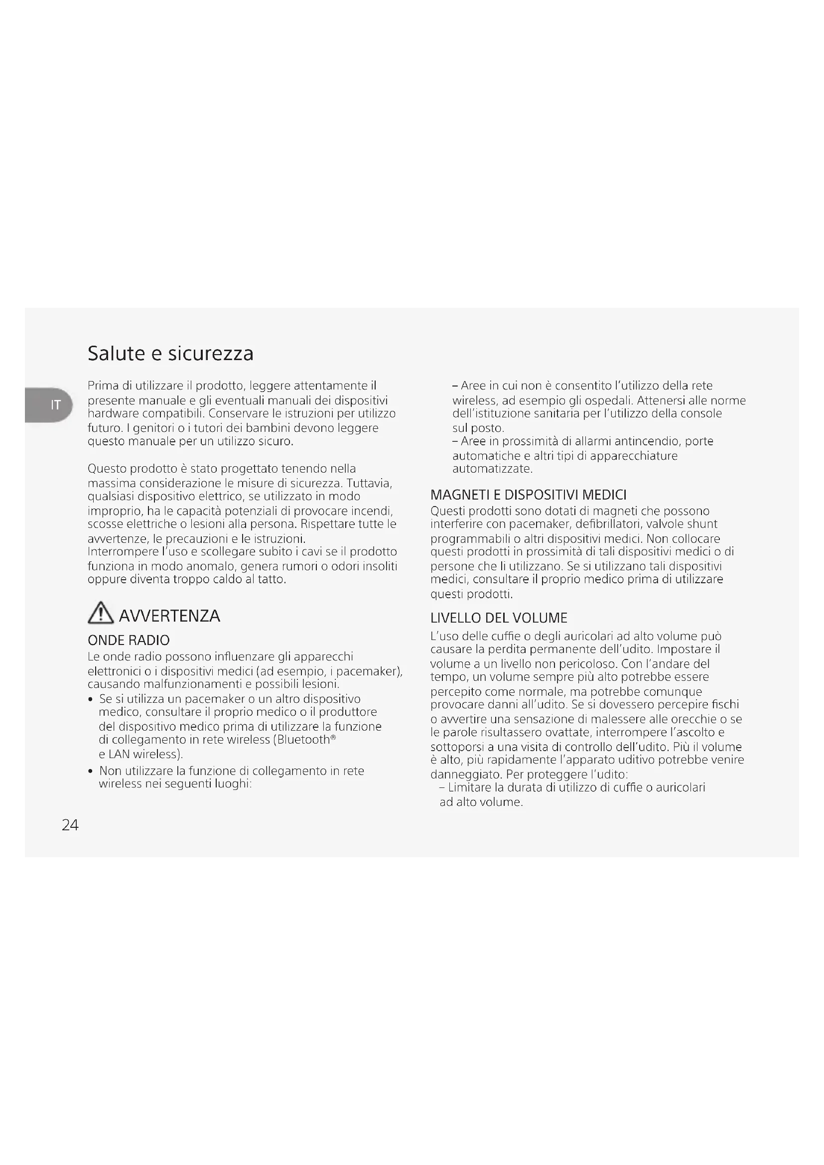 L’uso delle cue o degli auricolari ad alto volume può causare la perdita permanente dell’udito. Impostare il volume a un livello non pericoloso. Con l’andare del tempo, un volume sempre più alto potrebbe essere percepito come normale, ma potrebbe comunque provocare danni all’udito. Se si dovessero percepire fischi o avvertire una sensazione di malessere alle orecchie o se le parole risultassero ovattate, interrompere l’ascolto e sottoporsi a una visita di controllo dell’udito. Più il volume è alto, più rapidamente l’apparato uditivo potrebbe venire danneggiato. Per proteggere l’udito: – Limitare la durata di utilizzo di cue o auricolari ad alto volume.Prima di utilizzare il prodotto, leggere attentamente il presente manuale e gli eventuali manuali dei dispositivi hardware compatibili. Conservare le istruzioni per utilizzo futuro. I genitori o i tutori dei bambini devono leggere questo manuale per un utilizzo sicuro.Questo prodotto è stato progettato tenendo nella massima considerazione le misure di sicurezza. Tuttavia, qualsiasi dispositivo elettrico, se utilizzato in modo improprio, ha le capacità potenziali di provocare incendi, scosse elettriche o lesioni alla persona. Rispettare tutte le avvertenze, le precauzioni e le istruzioni.Interrompere l’uso e scollegare subito i cavi se il prodotto funziona in modo anomalo, genera rumori o odori insoliti oppure diventa troppo caldo al tatto. AVVERTENZA ONDE RADIO Le onde radio possono influenzare gli apparecchi elettronici o i dispositivi medici (ad esempio, i pacemaker), causando malfunzionamenti e possibili lesioni.• Se si utilizza un pacemaker o un altro dispositivo medico, consultare il proprio medico o il produttore del dispositivo medico prima di utilizzare la funzione di collegamento in rete wireless (Bluetooth® e LAN wireless).• Non utilizzare la funzione di collegamento in rete wireless nei seguenti luoghi: ITSalute e sicurezza